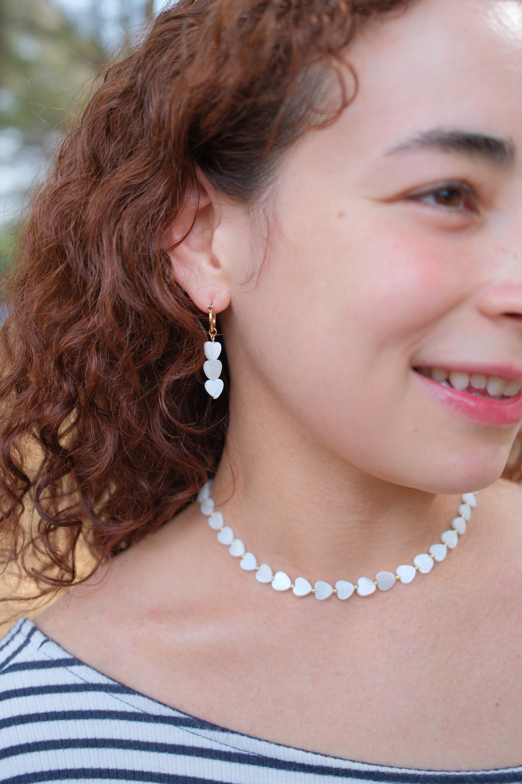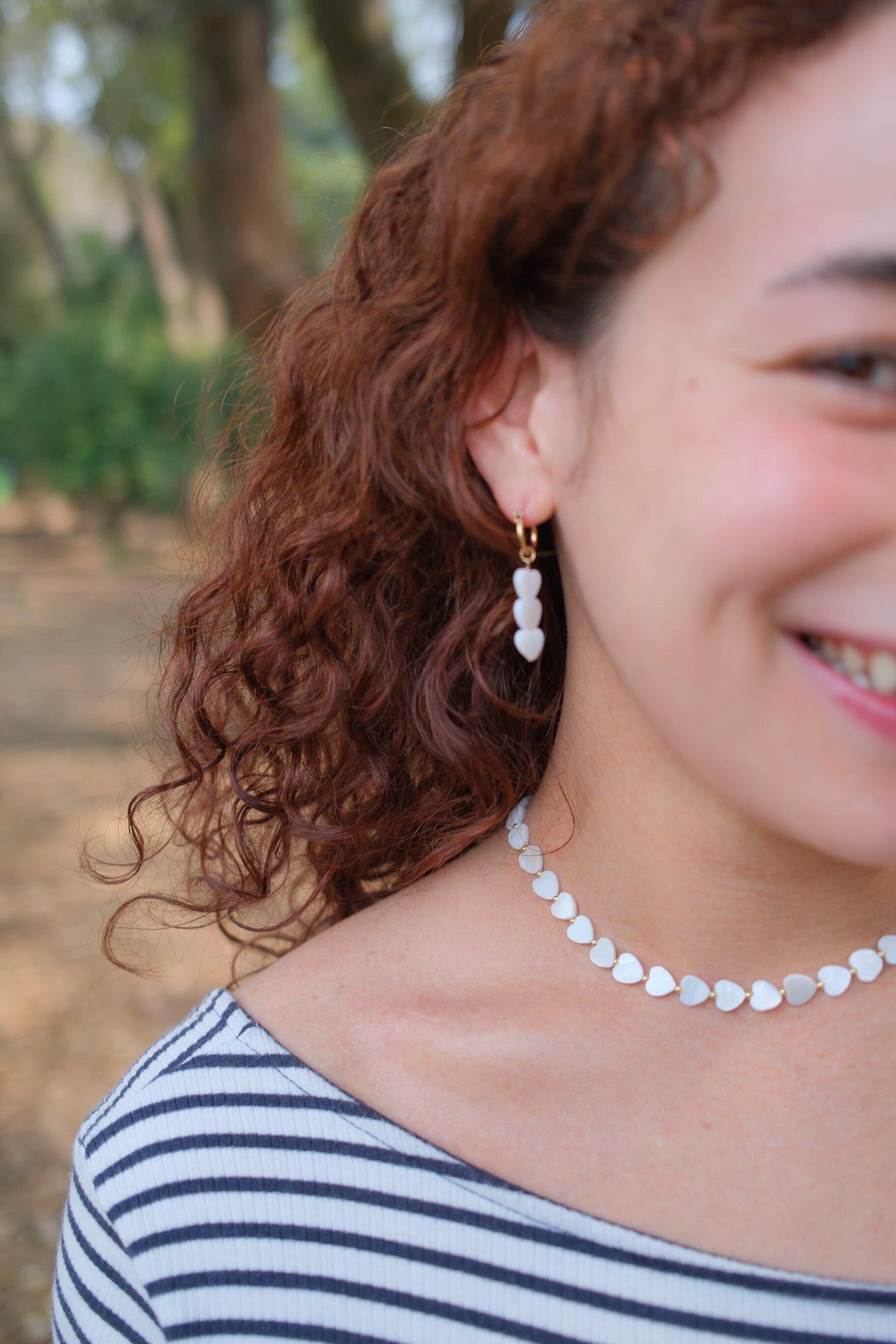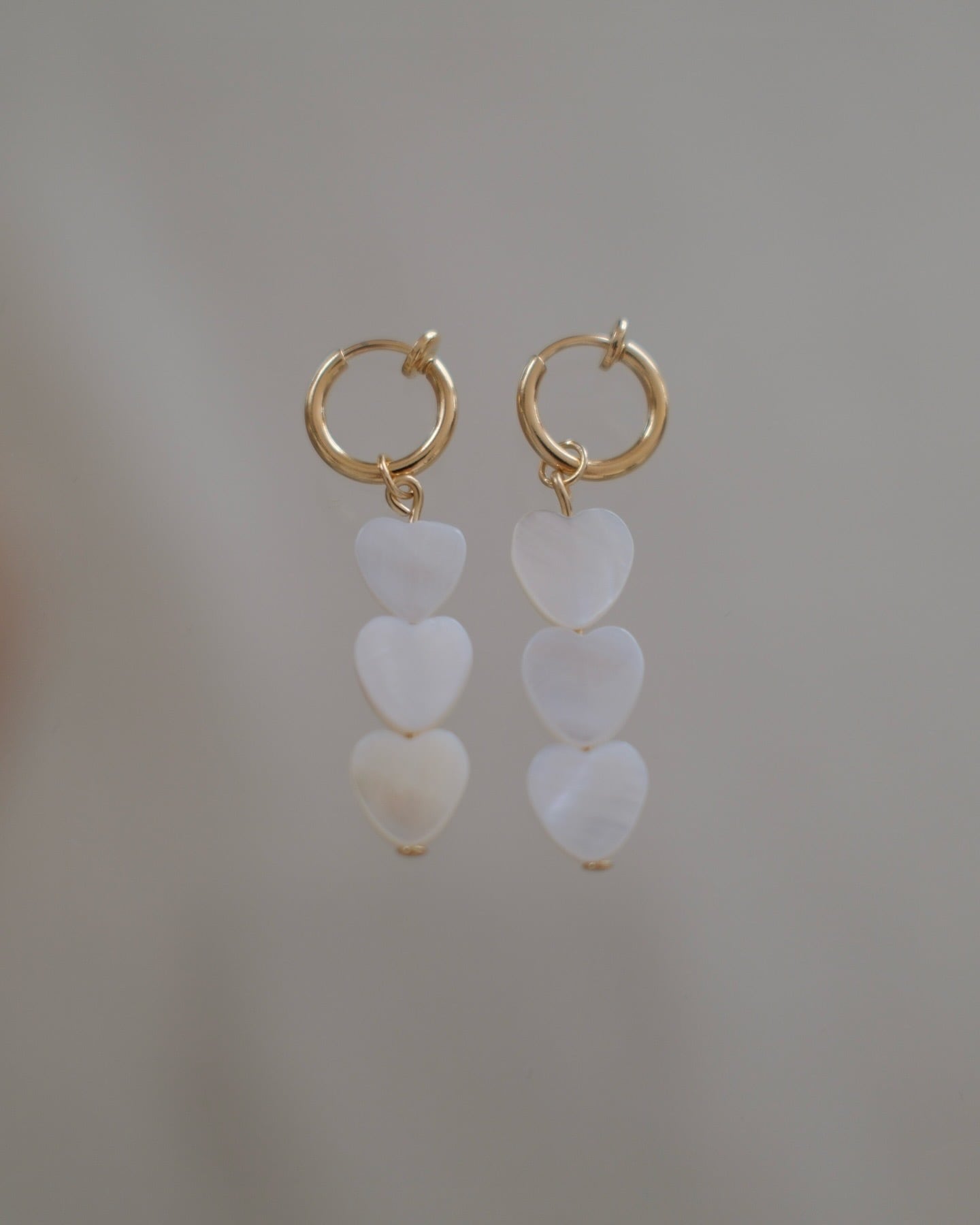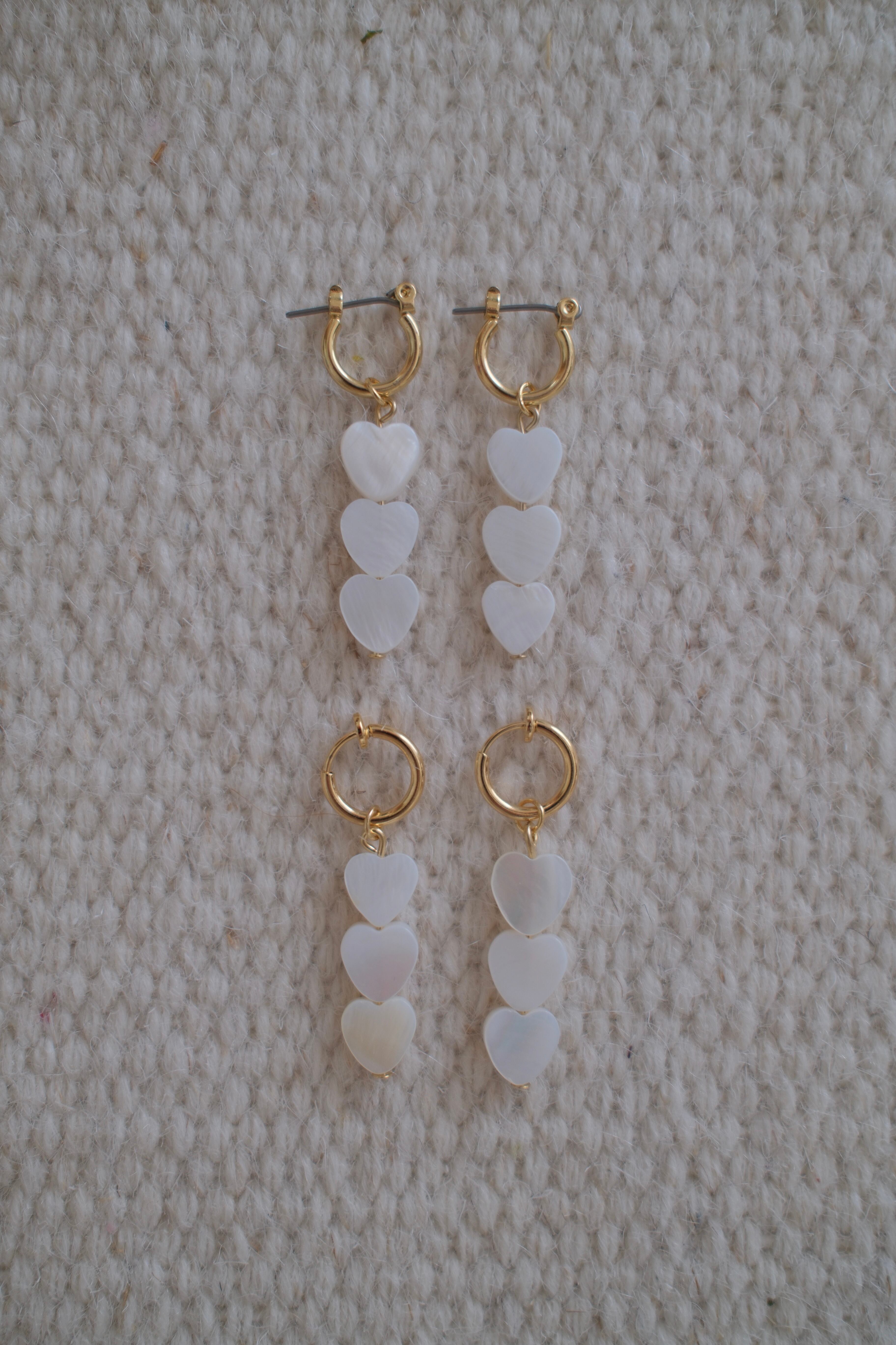ゴールドのフープに、白いシェル素材のハートが3つ連なったデザイン。