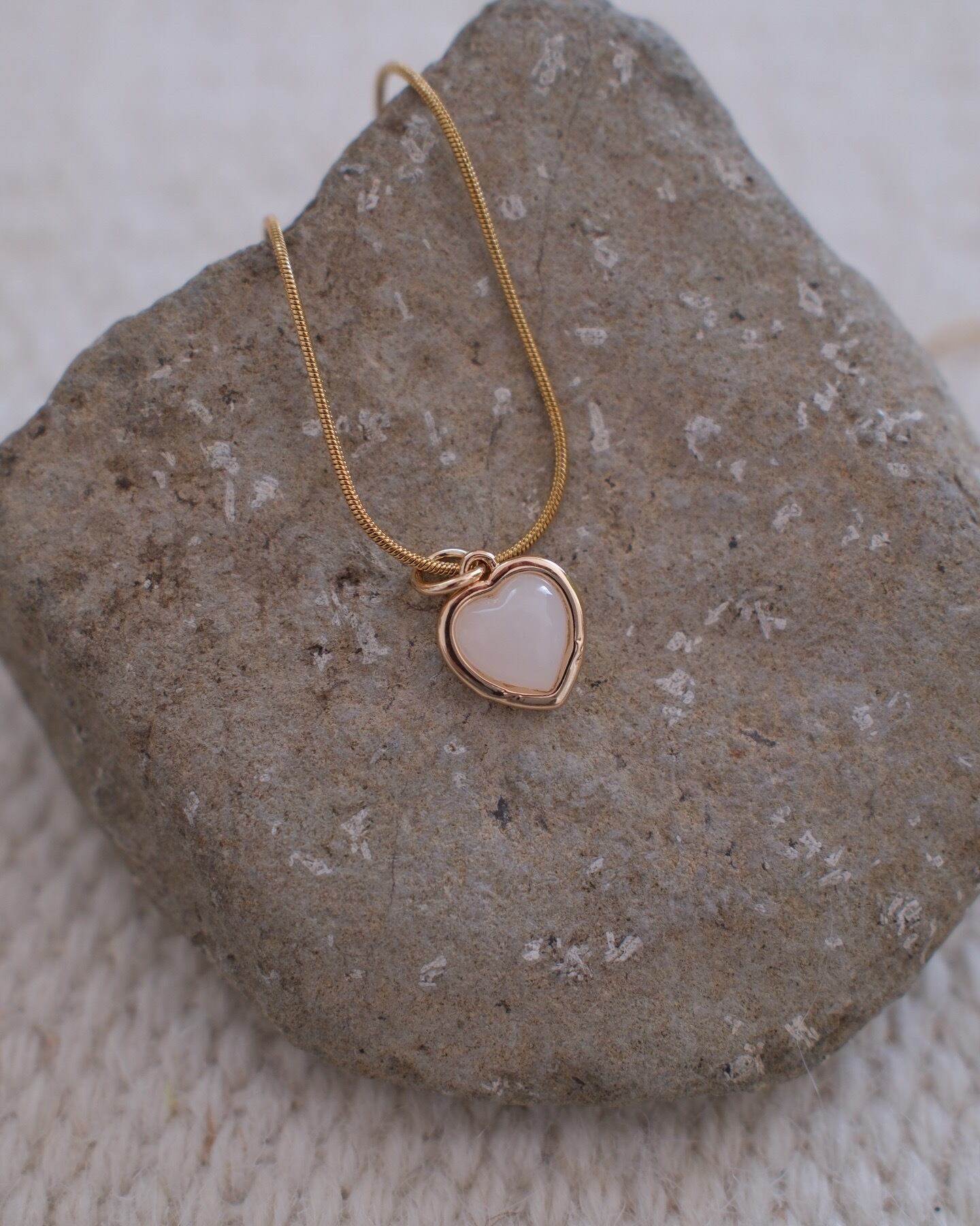 やわらかな光を湛えた淡いハートストーンが、胸元に優しく寄り添うペンダントネックレス。