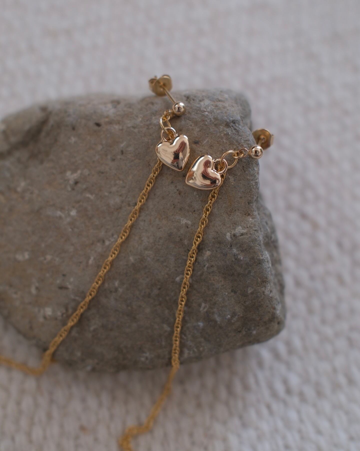 つやっとした立体的なハートに、さらりと揺れるチェーンがついたロングタイプのアクセサリー。