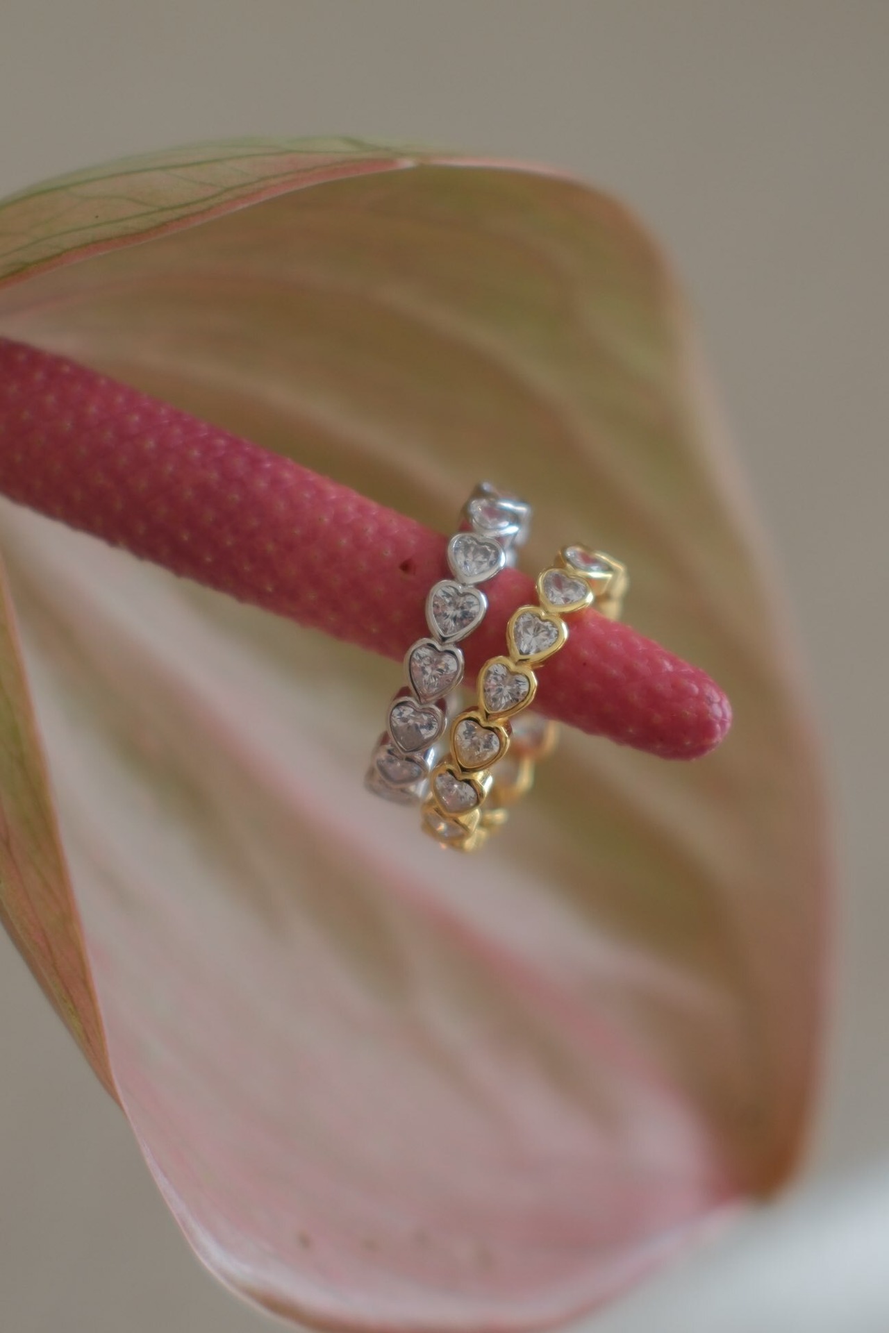 小さなハートの中にきらめくストーンを閉じ込めたような、愛らしさと上品さをあわせ持つハートストーンリング。リング全体に連なるハートモチーフが手元に華やぎをもたらしながらも、繊細なシルエットで甘くなりすぎず、大人の女性にもぴったりのデザインです。