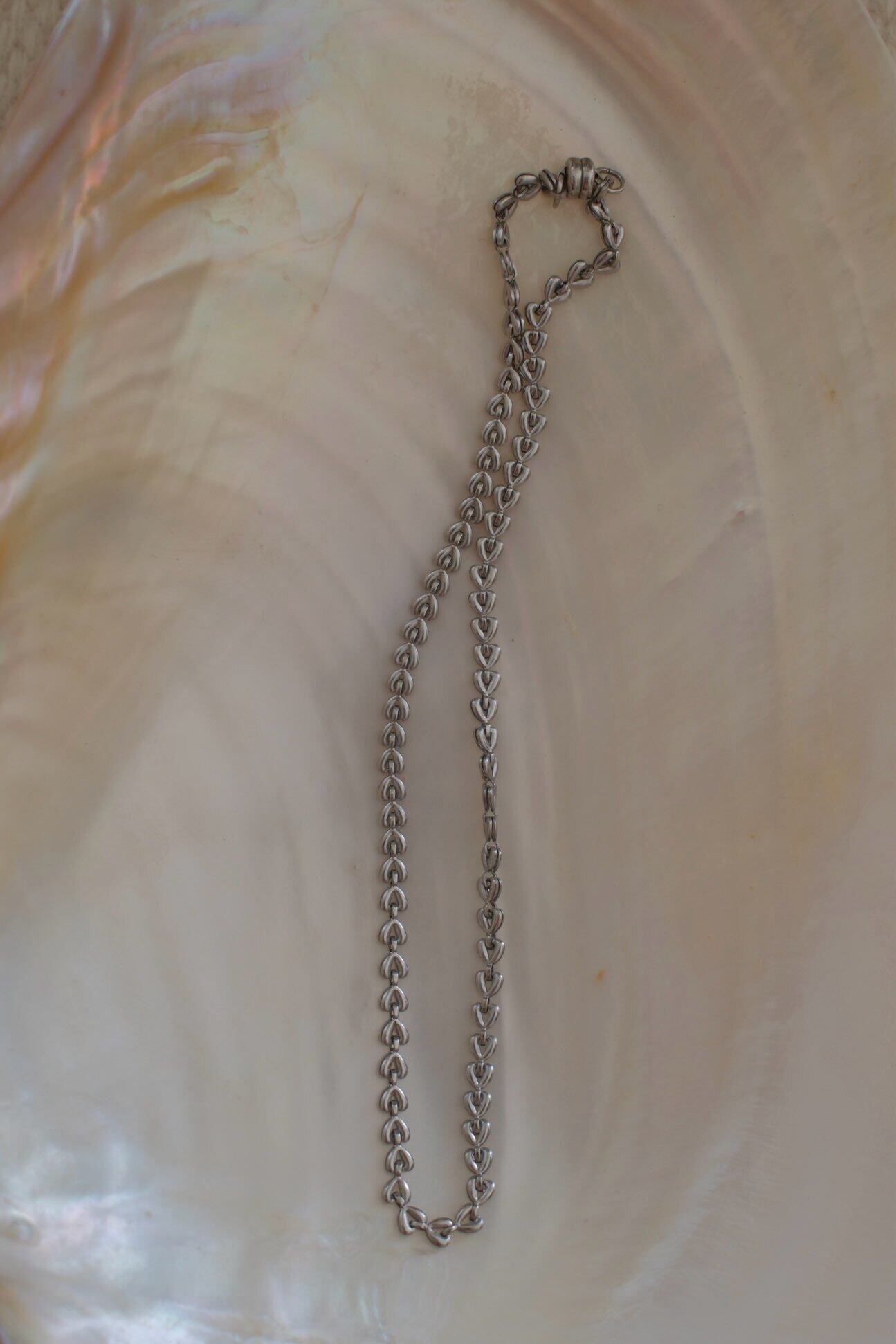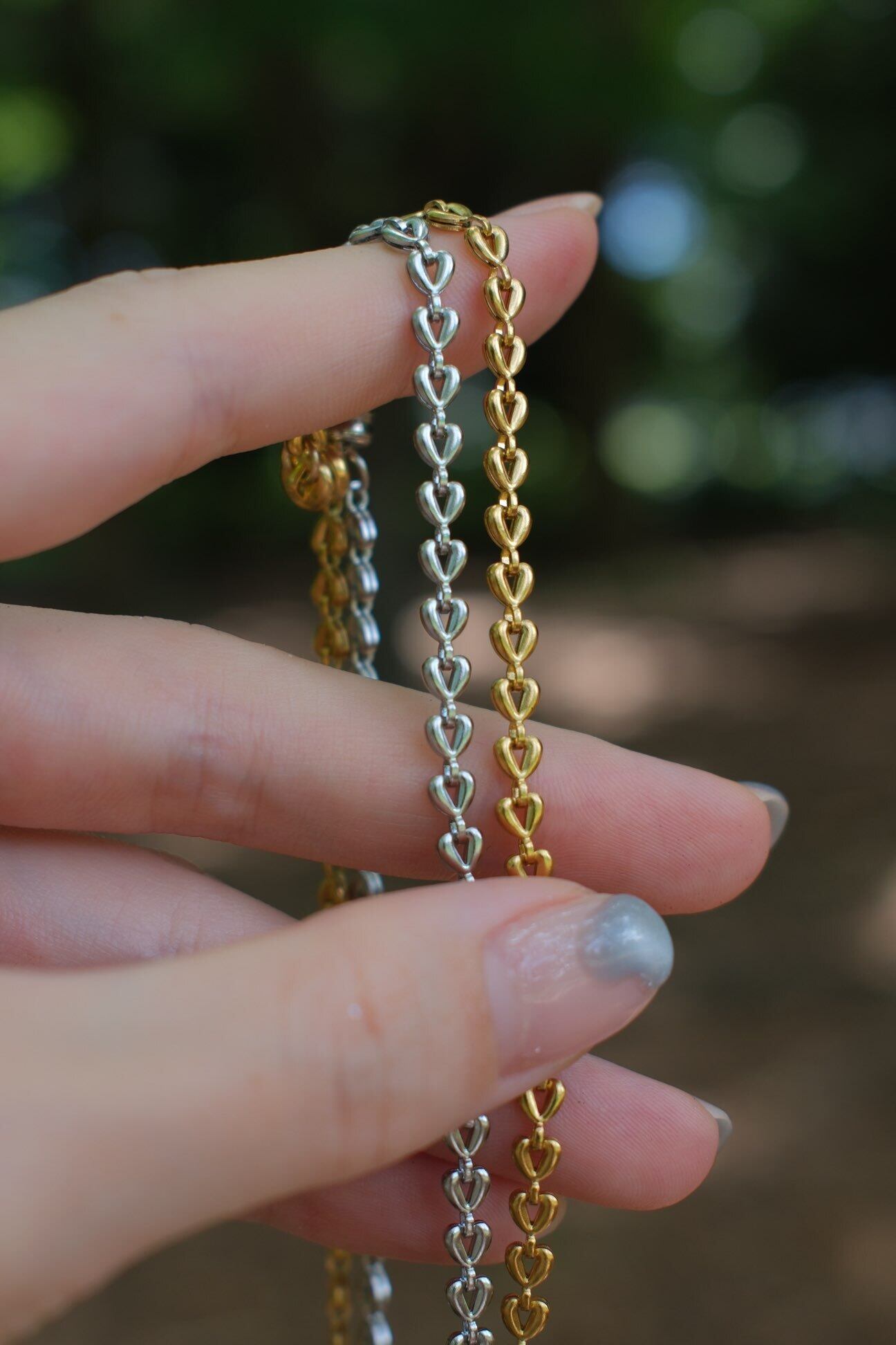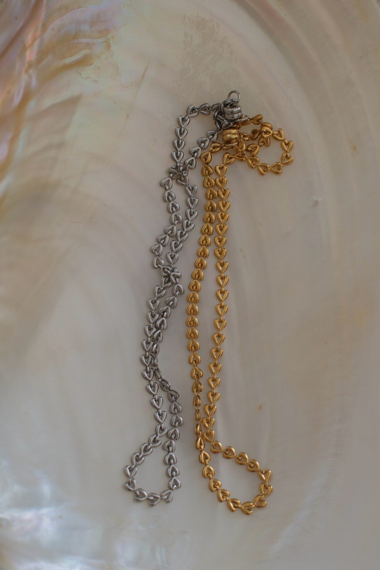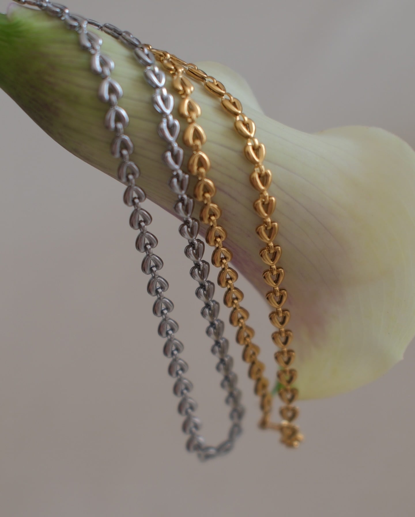 小さなハートが連なったチェーンが首元を可憐に彩る、ハートチェーンネックレス。丸みを帯びたハートモチーフが程よくきらめき、甘すぎず大人の可愛らしさを引き出してくれます。シンプルなデザインだからこそ、カジュアルにもきれいめにも溶け込みやすく、毎日身につけたくなる一本に。
