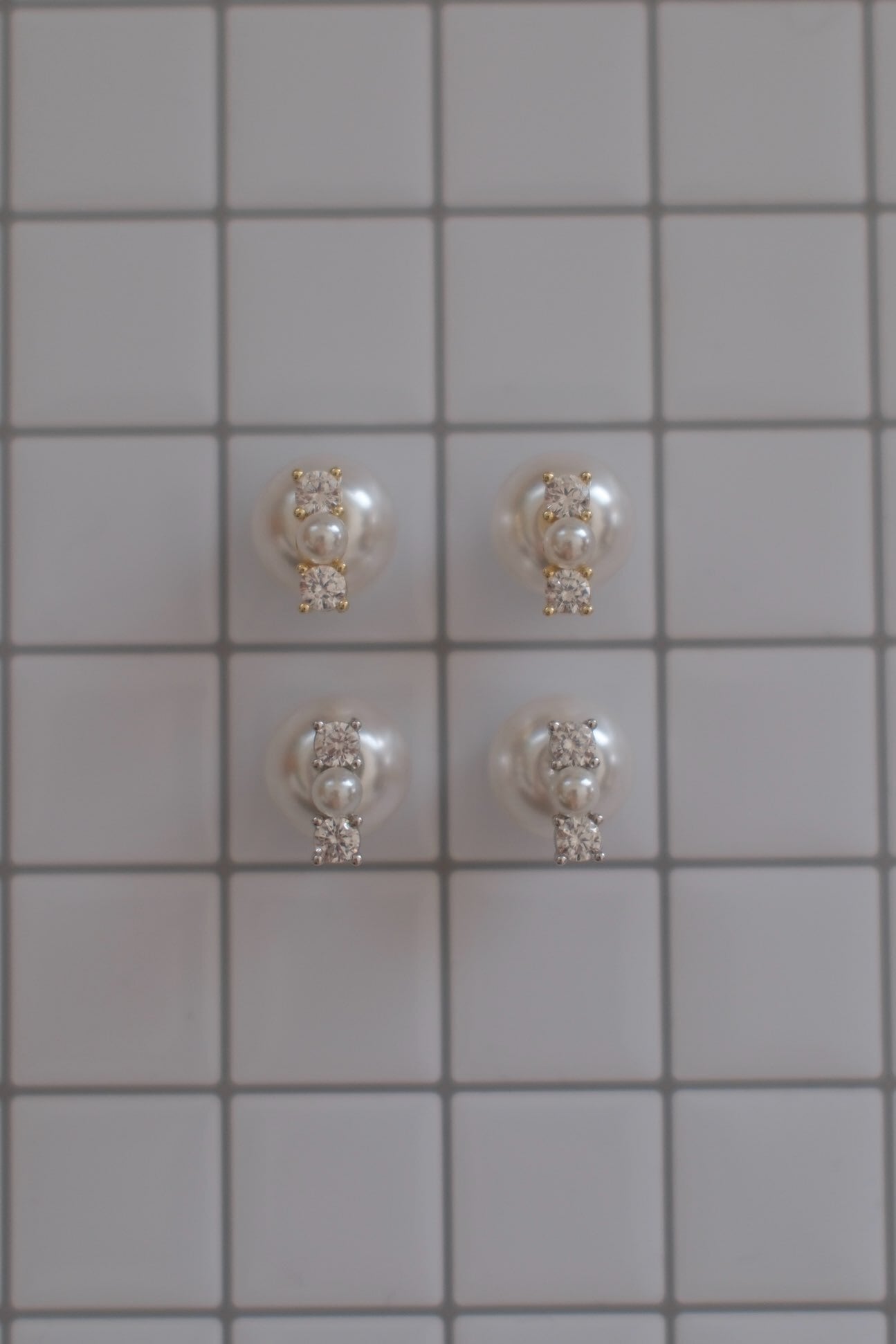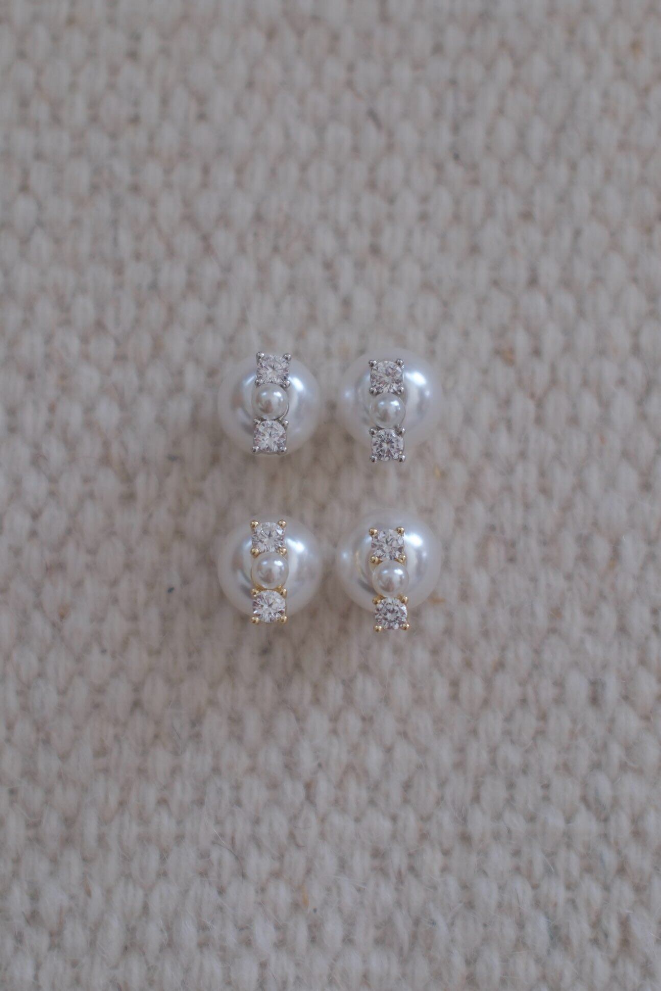 ころんとした艶やかなパールに、きらりと光る2粒のストーンを添えたシンプルで洗練されたデザイン。小ぶりながらも存在感があり、オフィスやデイリーコーデにそっと華やかさを加えてくれます。シルバーとゴールドの2色展開で、シーンや気分に合わせてお選びいただけます。