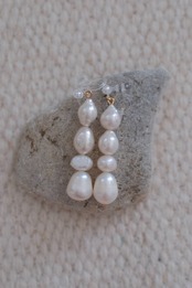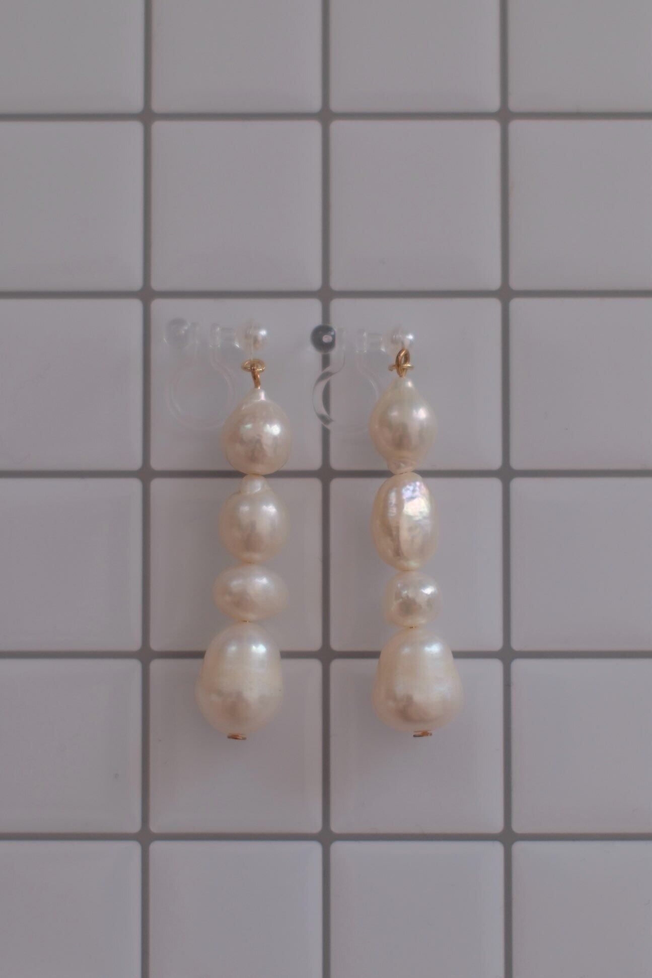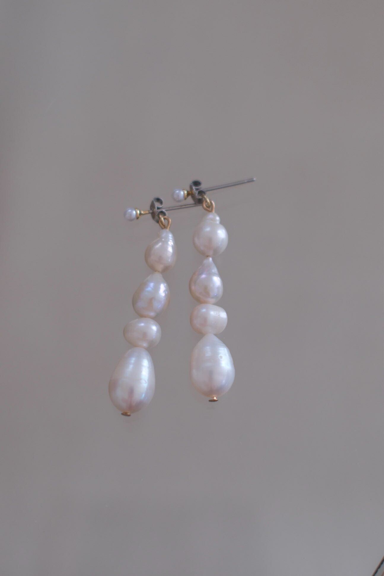 自然のままのフォルムが美しいバロックパールを連ねた、揺れるたびに優雅に輝くロングピアス。ひとつひとつ異なるかたちが個性を際立たせ、ナチュラルながらも印象的な存在感を放ちます。上品な佇まいで、フォーマルにもカジュアルにもそっと寄り添ってくれるアイテムです。