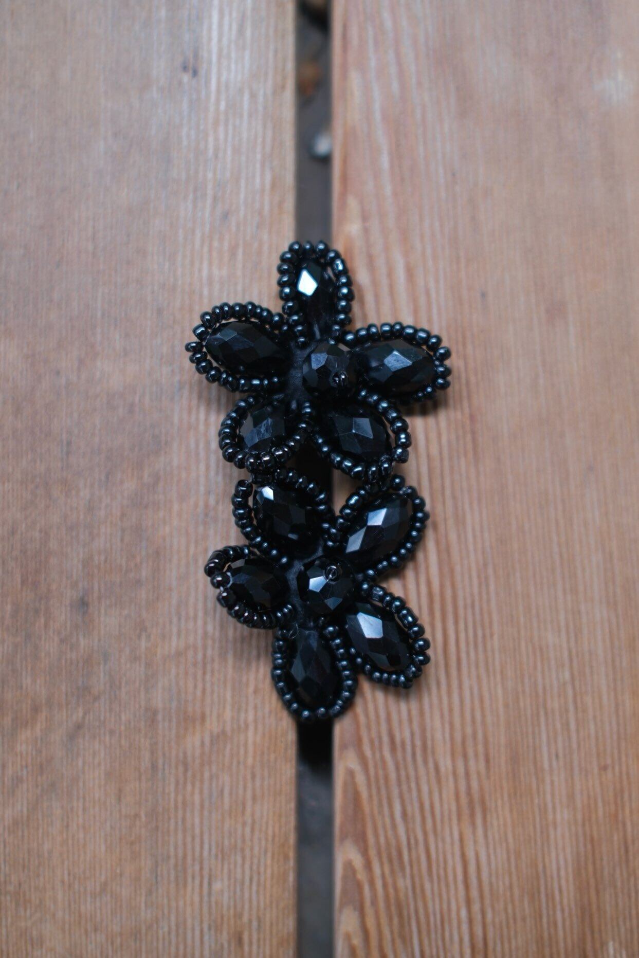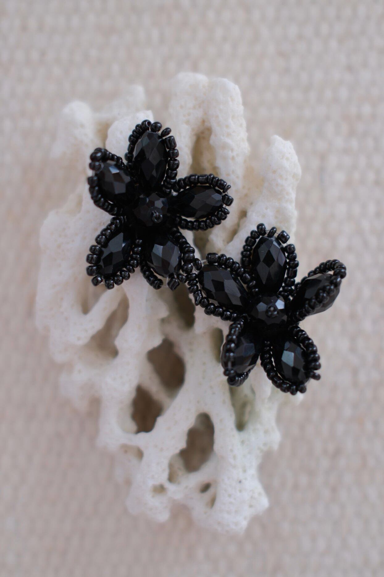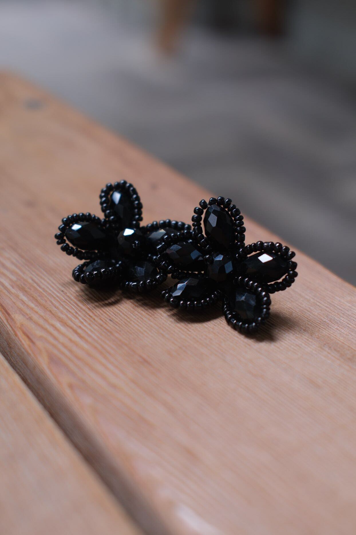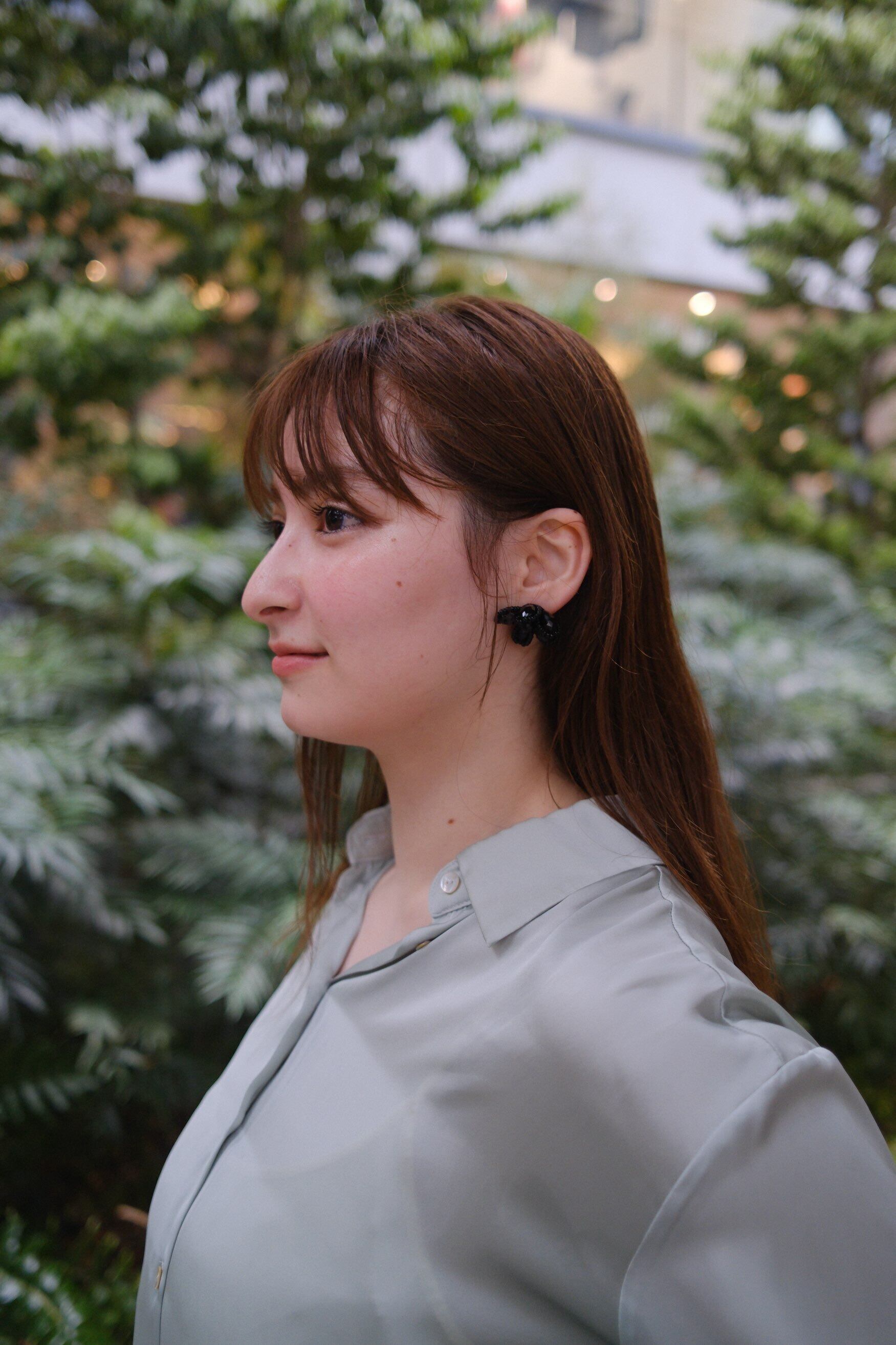 艶やかなブラックビーズを花びらのように重ねた、大人の華やかさを感じさせるデザイン。黒一色の奥行きが横顔を引き締め、シンプルなまとめ髪やアップスタイルに合わせると立体感がより際立ちます。モノトーンコーデに添えるとぐっとシックに、白シャツやジャケットに合わせると“きちんと感”にほどよい遊び心をプラス。甘すぎないフラワーモチーフだからこそ、日常にも特別な日にも選びたくなる存在です。ピアス・イヤリングどちらもご用意しています。