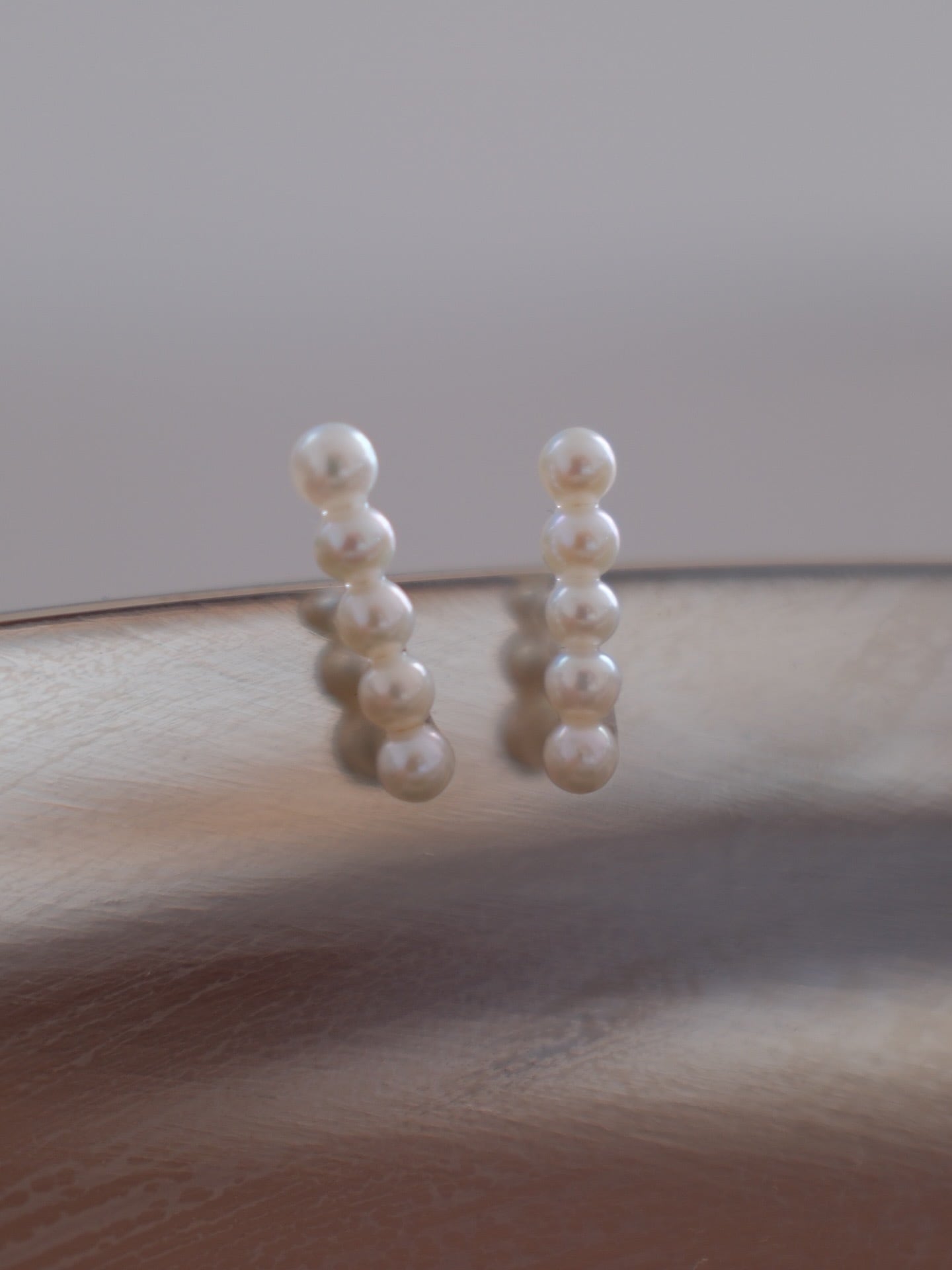 小粒のパールを縦にすっと並べたシンプルなラインが、耳元を上品に彩るデザイン。使用しているのはすべてAAAランクの淡水パールのみを厳選しており、どの角度から見ても照りと艶が美しく、品質の高さが感じられます。すっきりとした縦のシルエットが顔まわりをシャープに見せつつ、パールならではの柔らかな艶めきが女性らしさを添えてくれるのも魅力。セレモニーやお仕事シーンにはもちろん、デニムやシャツに合わせて日常を少し格上げするのもおすすめです。ピアス・イヤリングどちらもご用意しています。