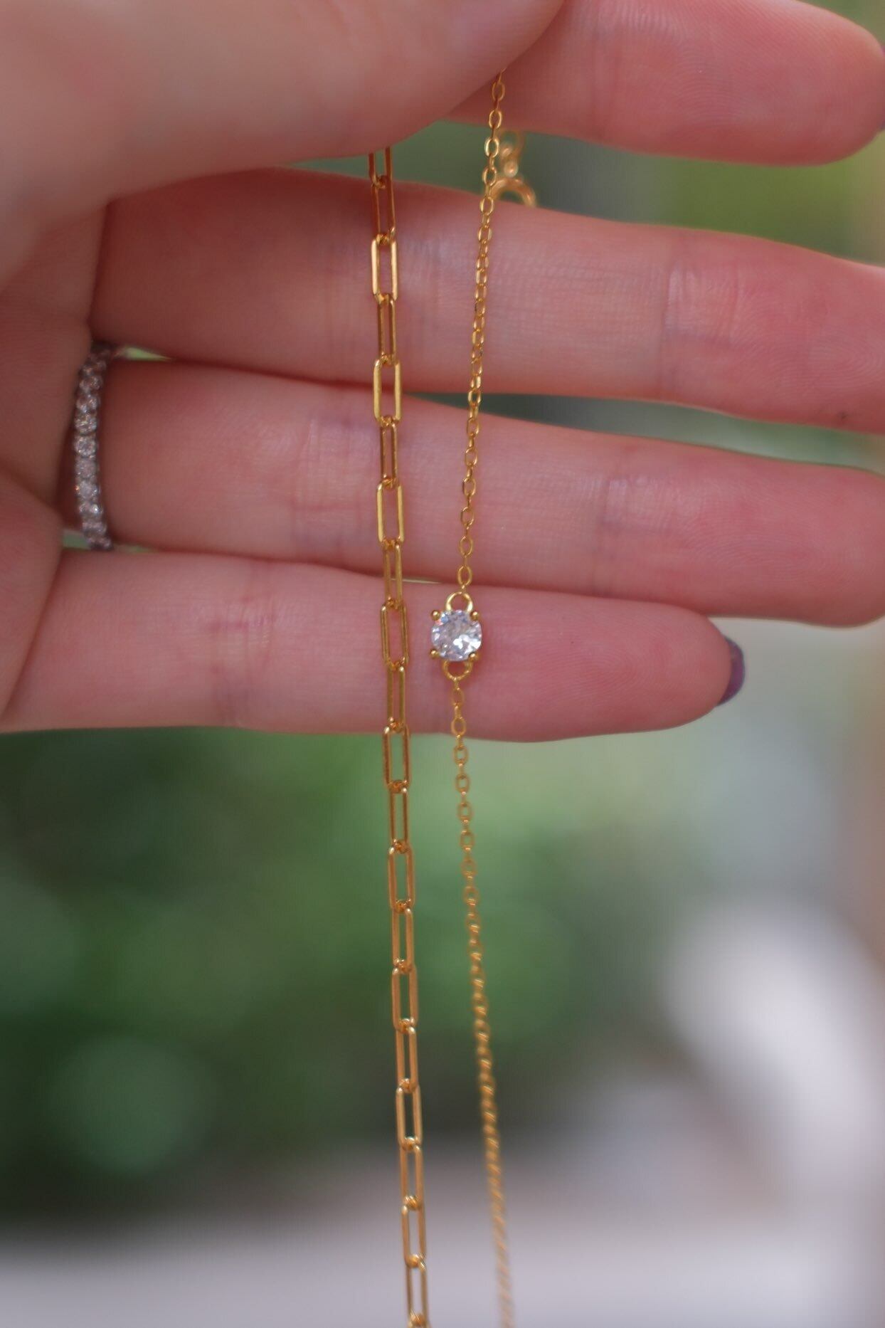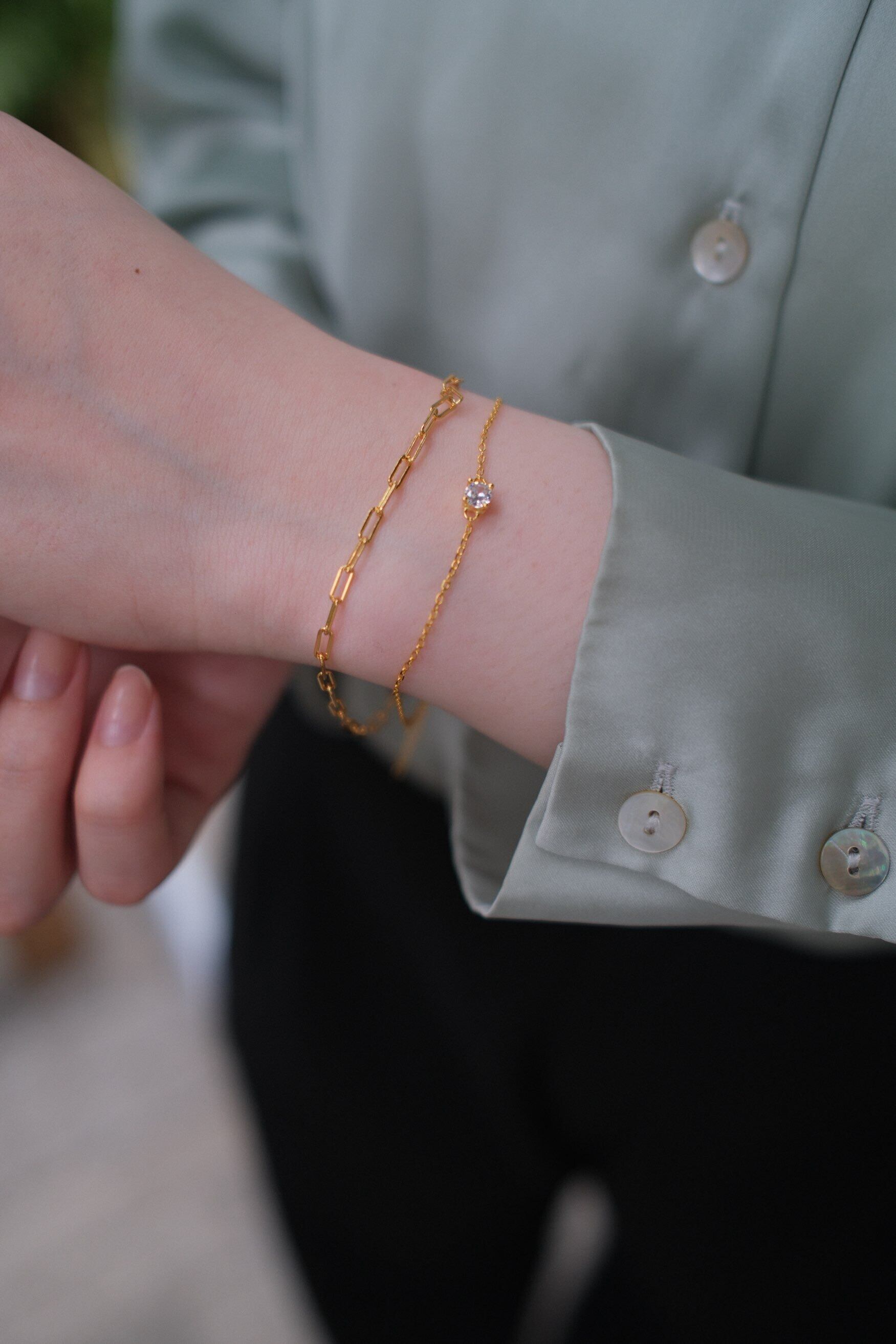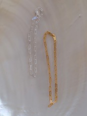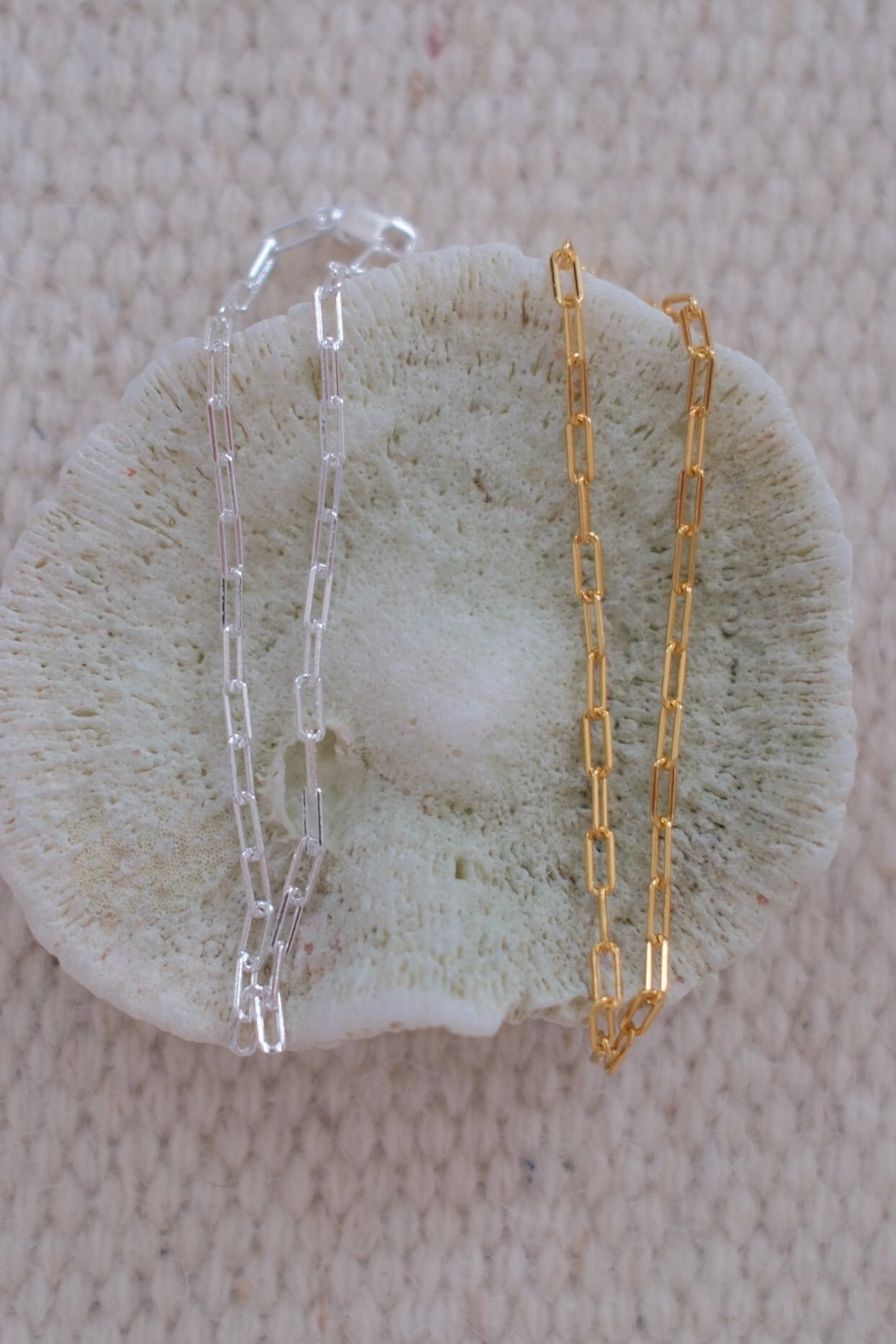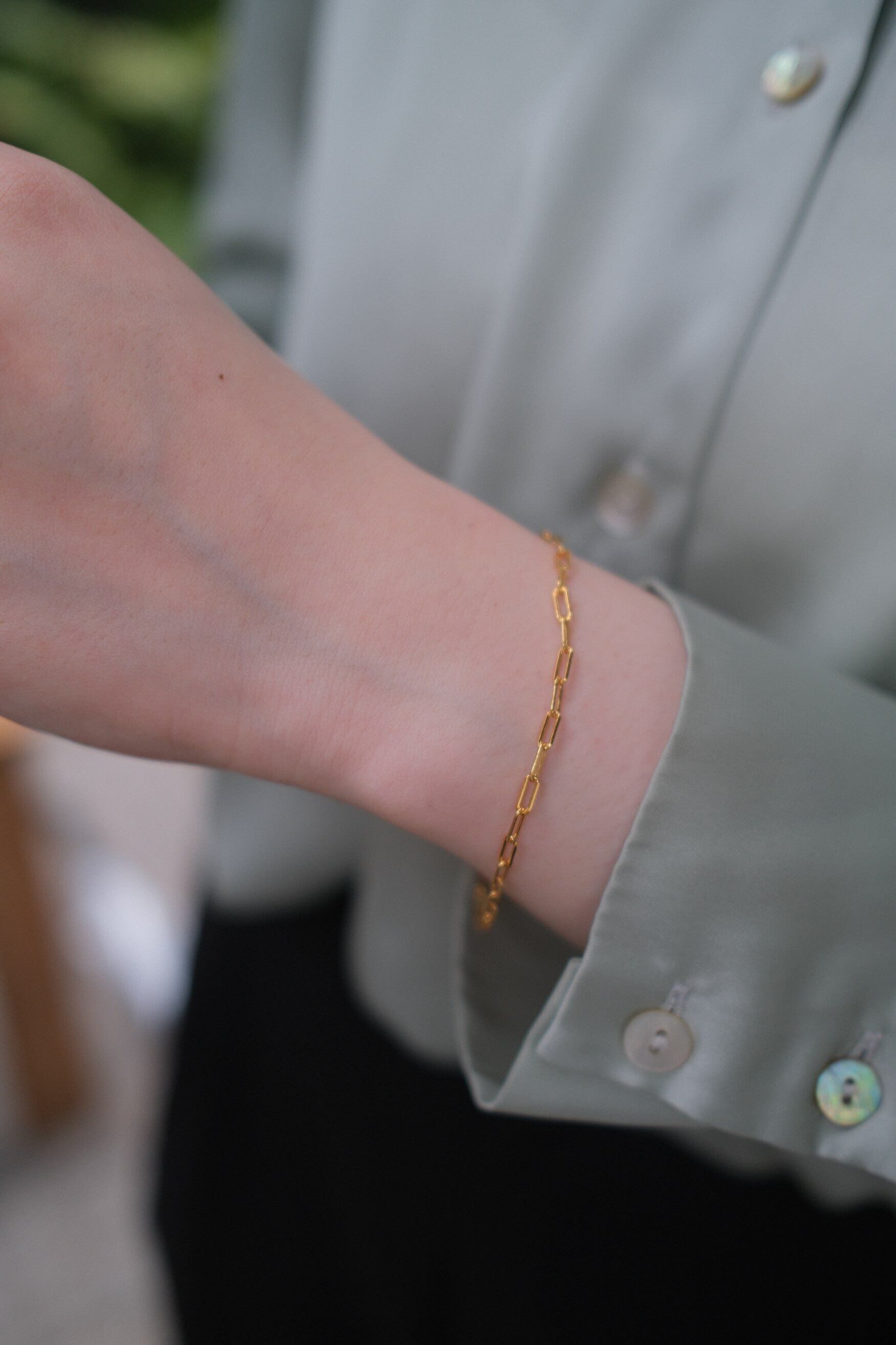 直線的なシルエットが印象的なペーパークリップチェーンのブレスレット。素材にはシルバー925を使用しており、錆や色褪せの心配が少なく、長くデイリーにお使いいただけるワンランク上のクオリティです。フラットな面が光をすっきりと反射して手元をスマートに見せ、単体はもちろん、華奢なブレスレットや腕時計との重ね付けでも美しくまとまります。特にPetite Haloとの相性は抜群で、質感の違いを楽しみながらスタイリングを引き立てられます。