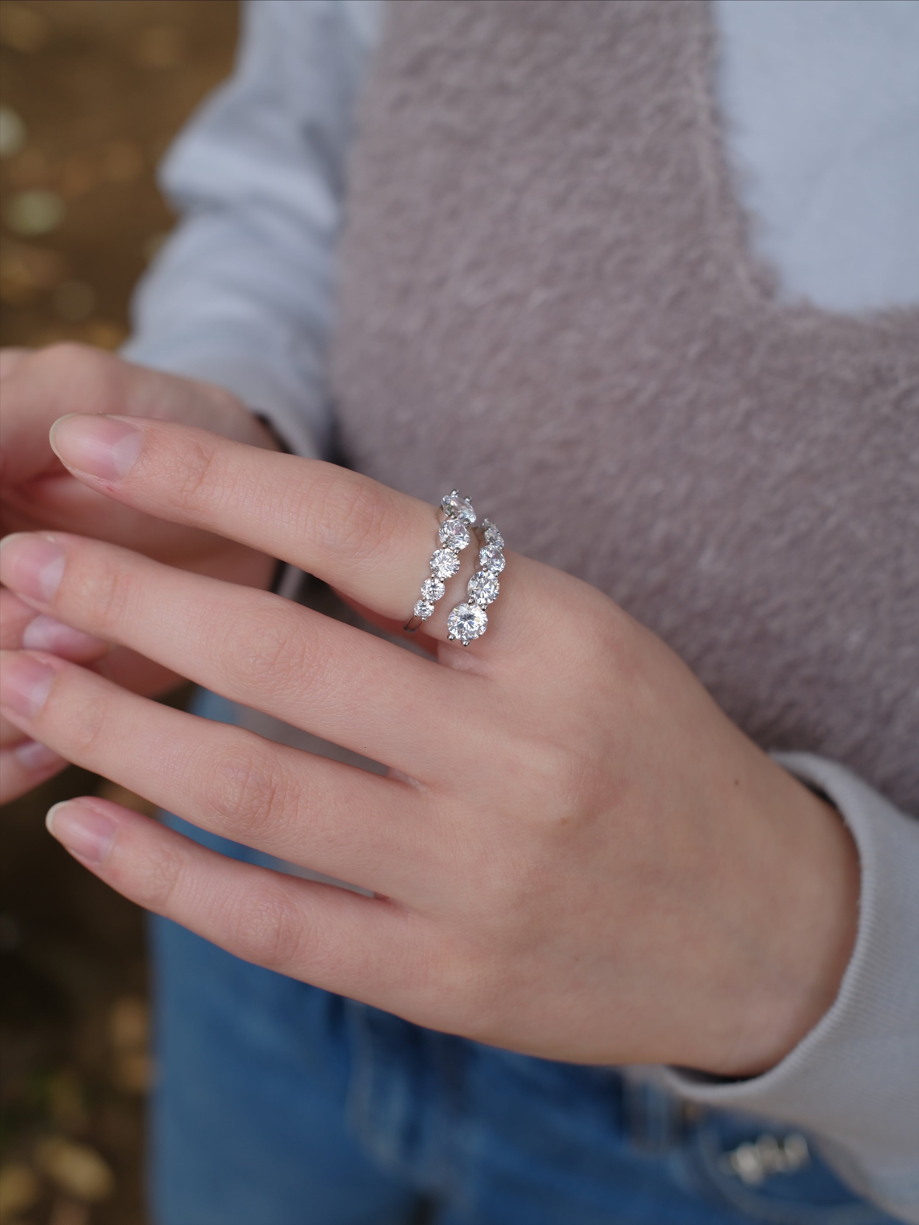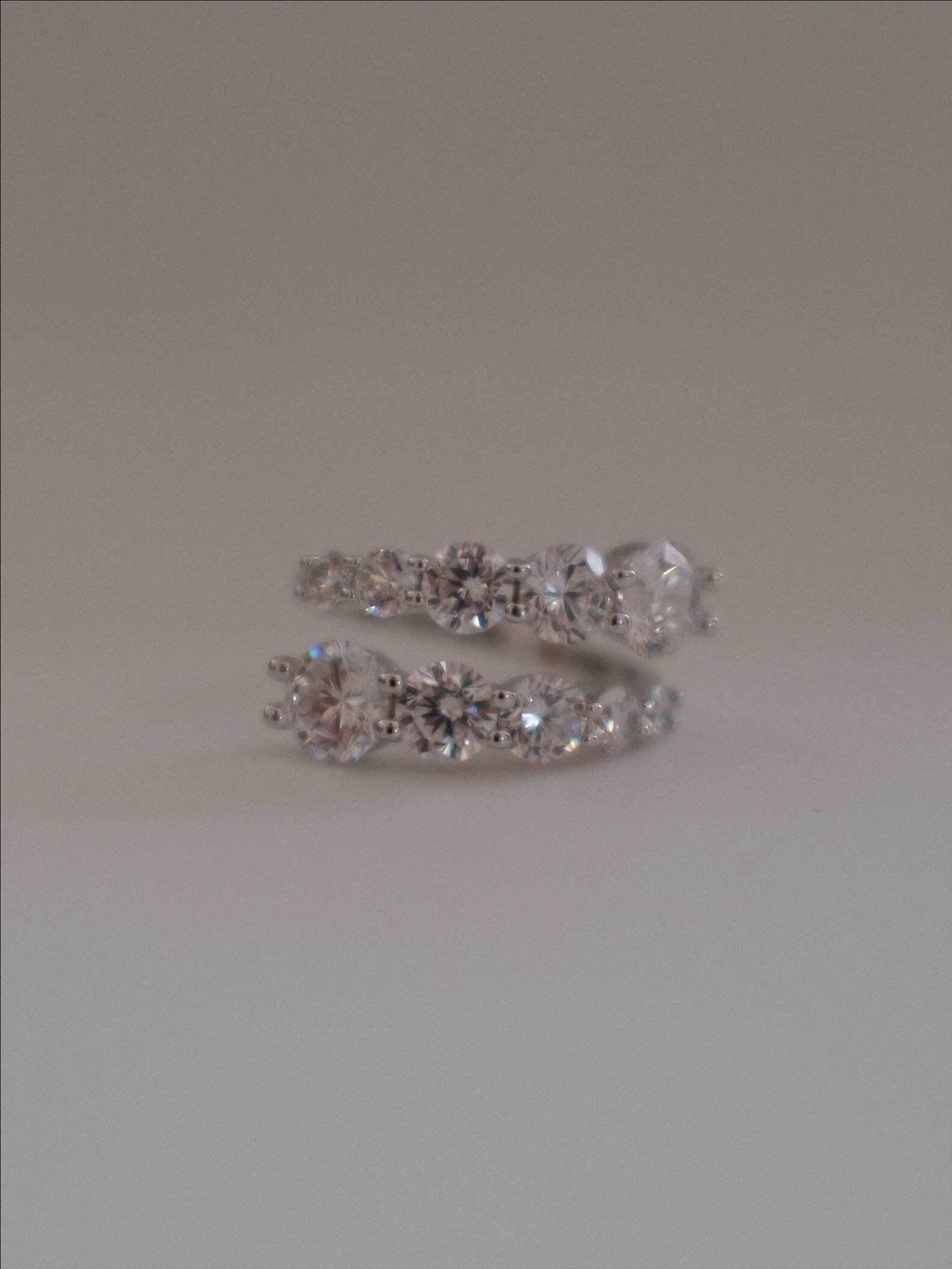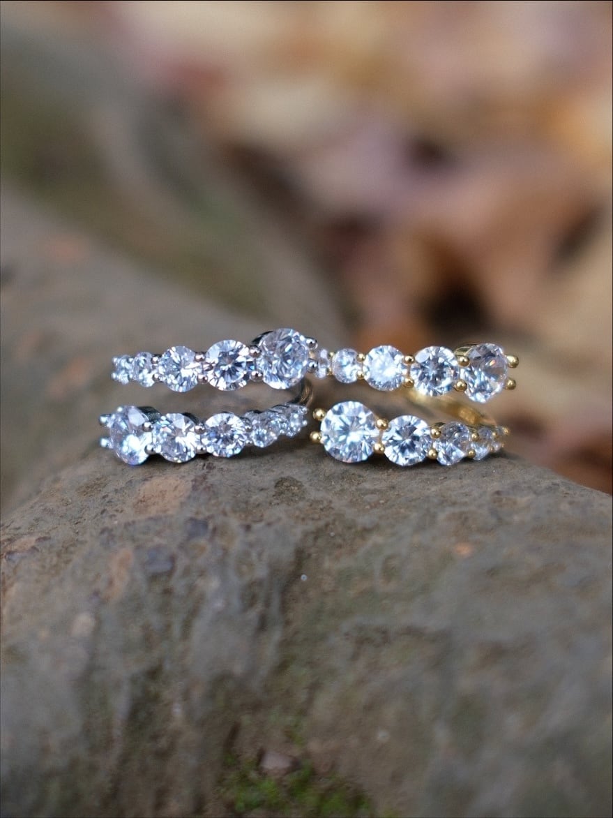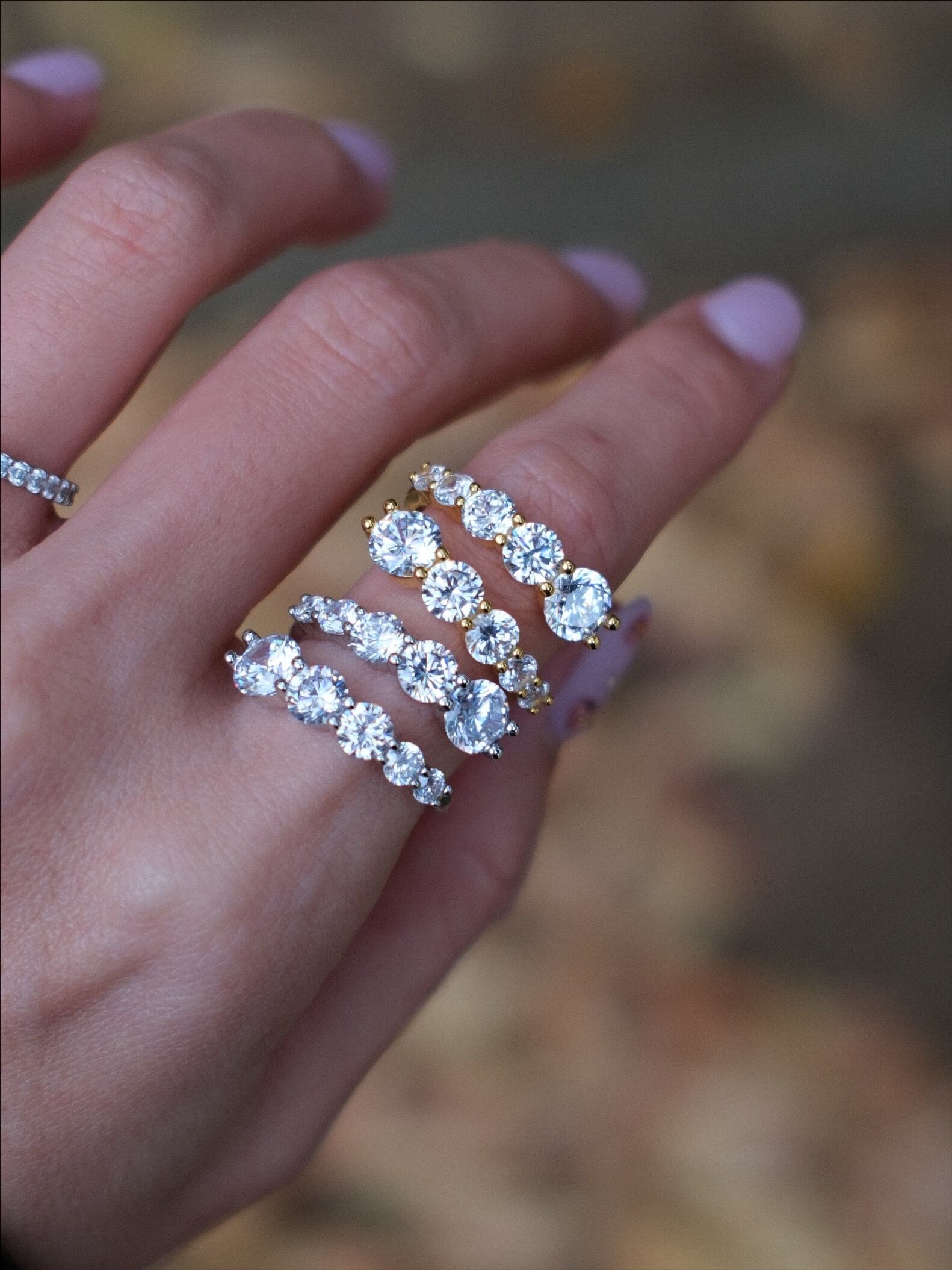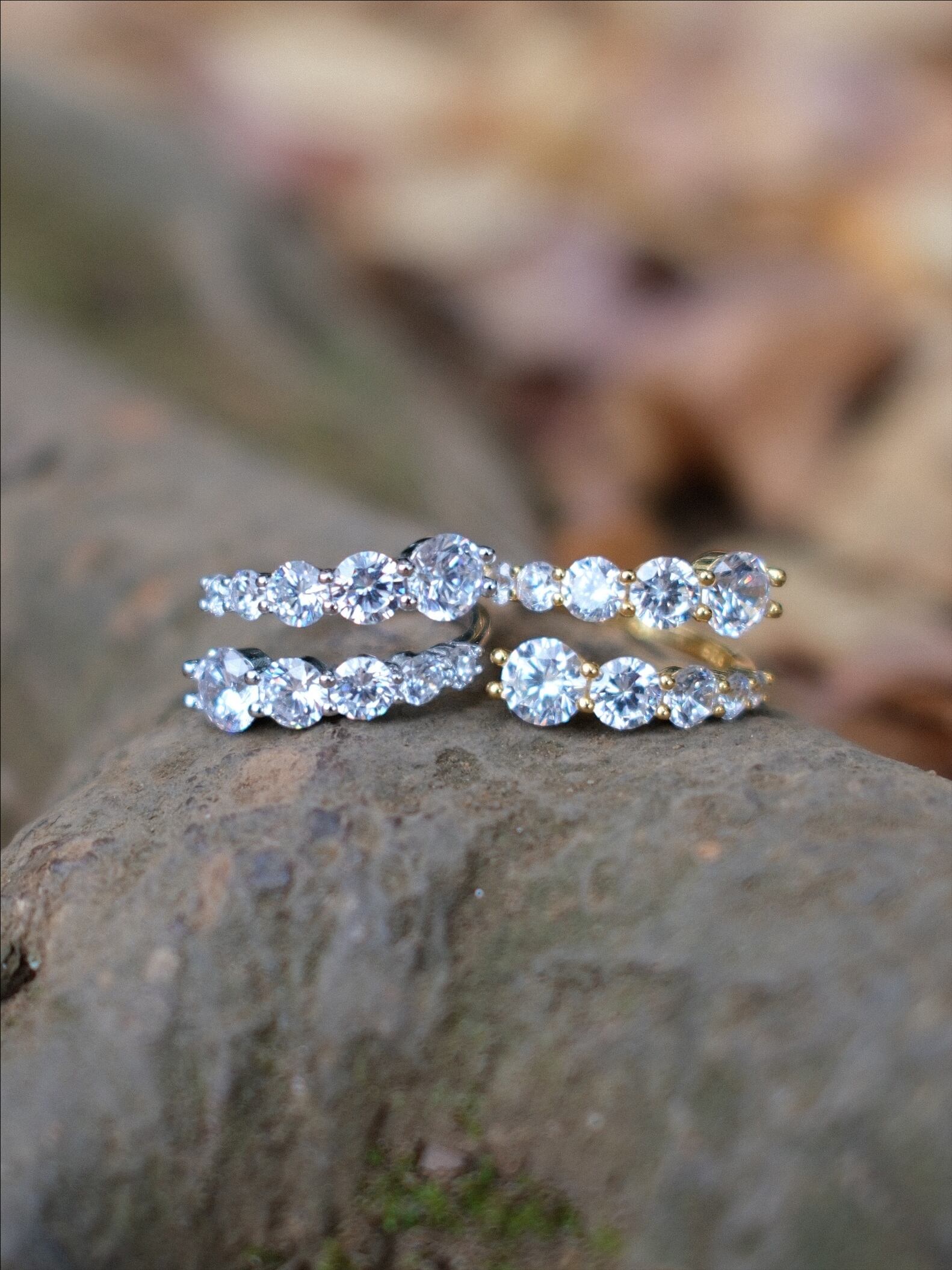 クリスタルのように澄んだ輝きを放つキュービックジルコニアを連ねた、光の帯のようなミニマルリング。