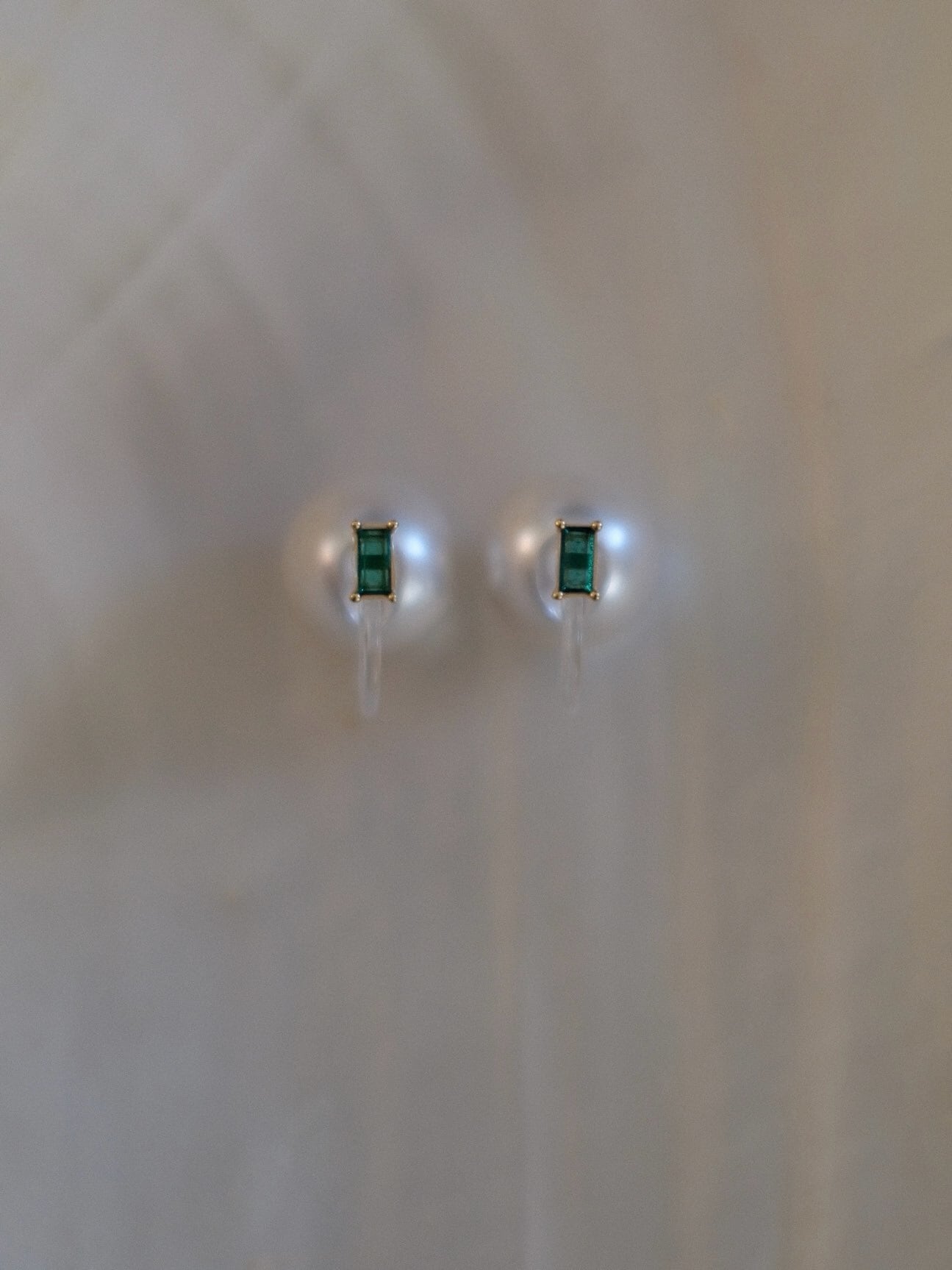 深みのあるグリーンが印象的な、バゲットカットストーンを使用したミニマルなピアス。