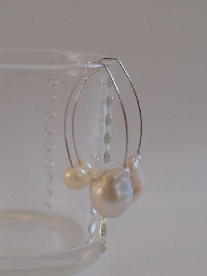フープの中に淡水パールが浮かぶように配された、他にはない独創的なフォルムが印象的なイヤリング/ピアス。
