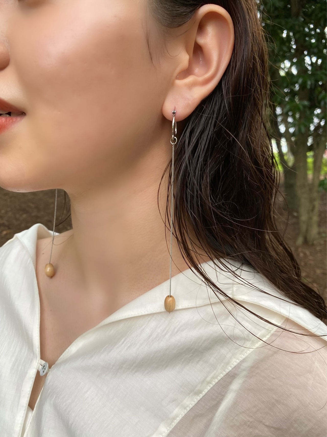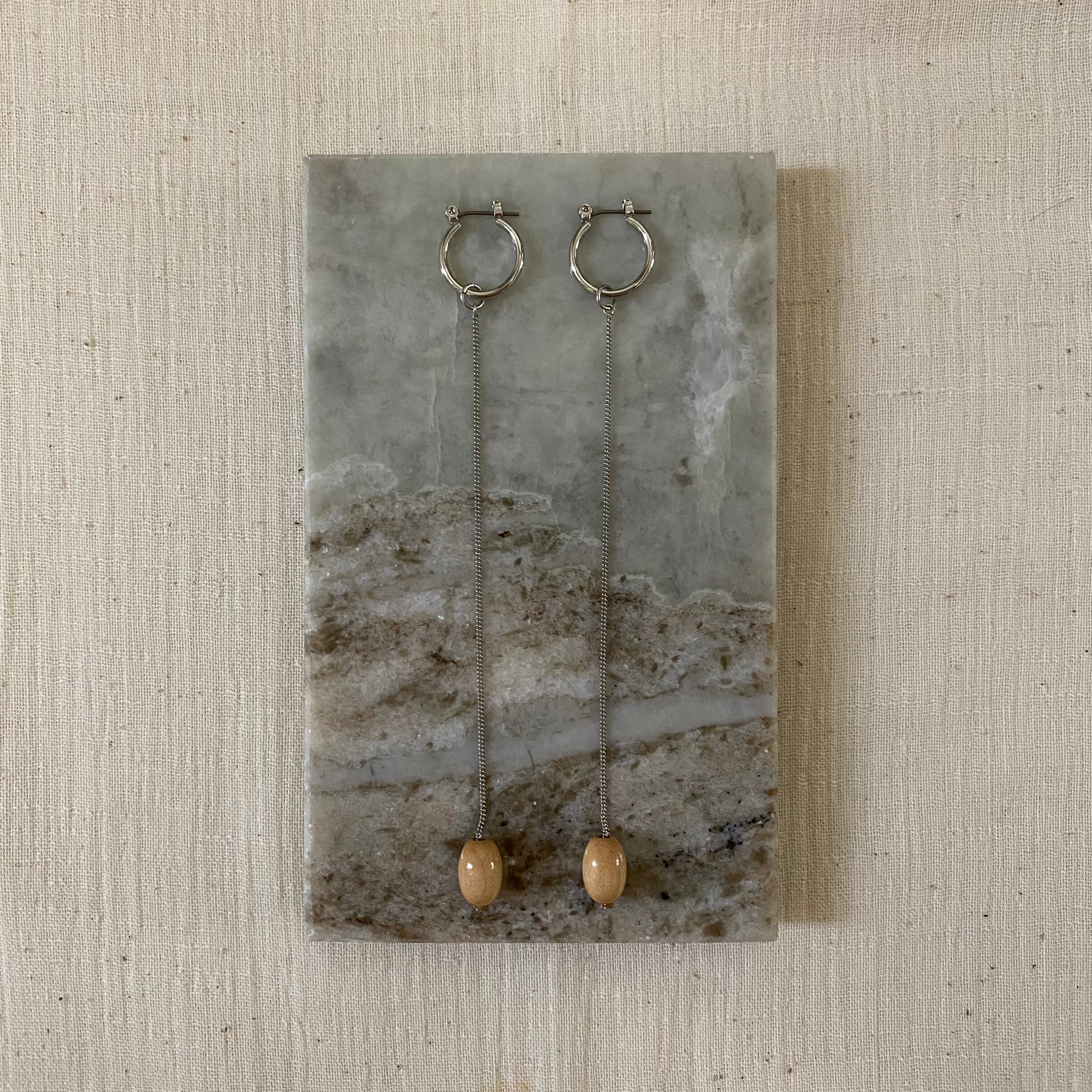 シルバーチェーンという少し強めの印象を持ちつつも、艶感のあるドイツ製ウッドビーズがちょうどいいバランスをもたらしてくれます。