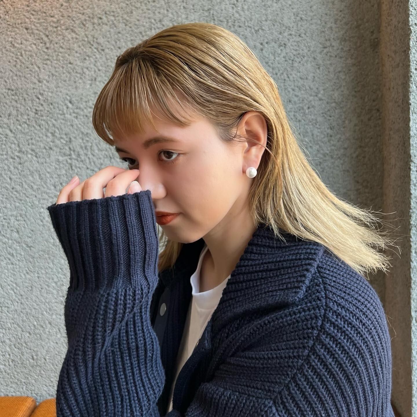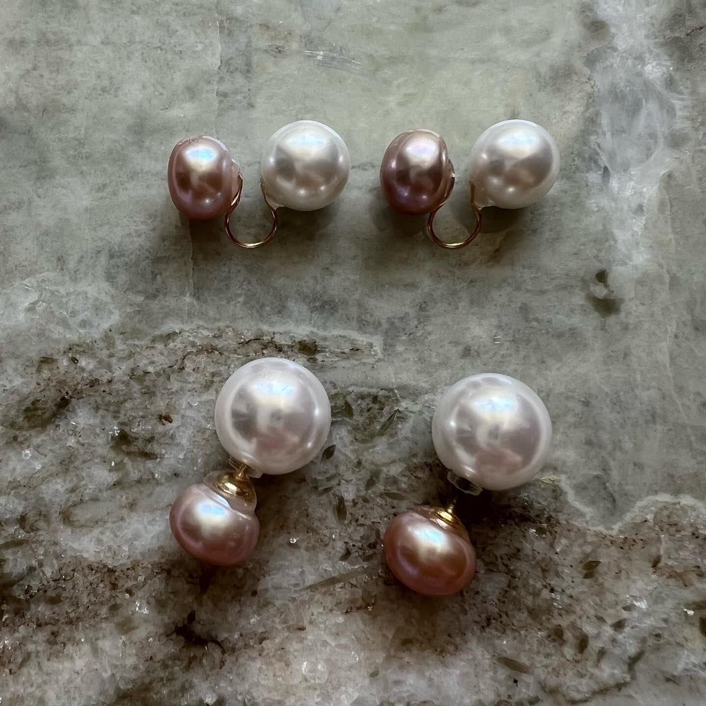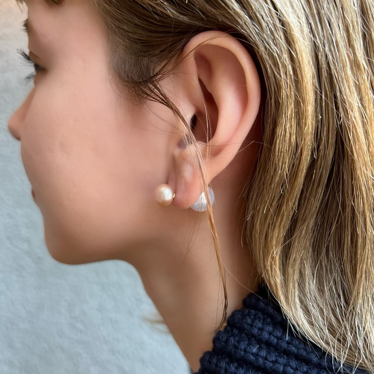 もう片方のパールはアクリルパールを使用し、サイズもピンクの淡水パールより少し大きくすることで、ぽってり感を出しつつ、異素材を楽しんでいただける仕様に仕上げました。
