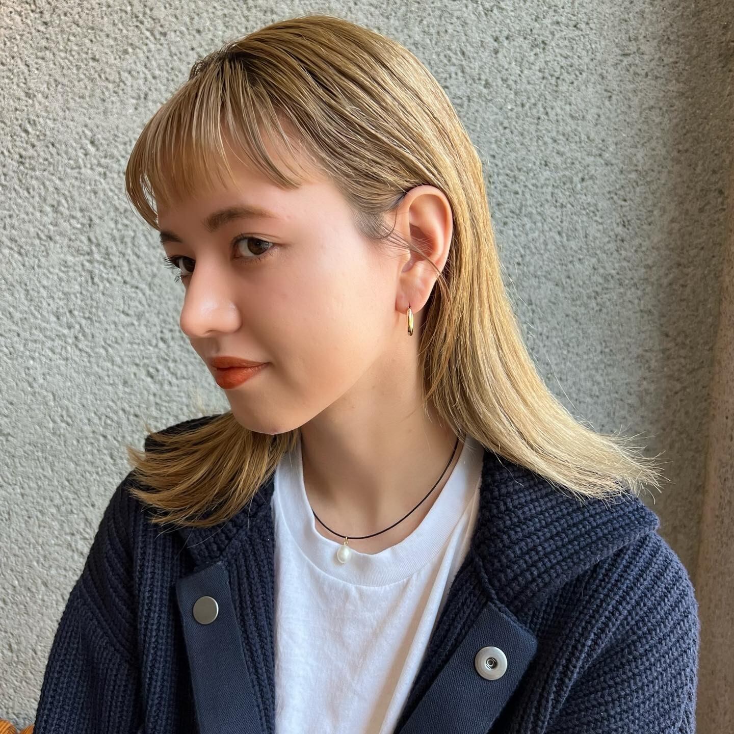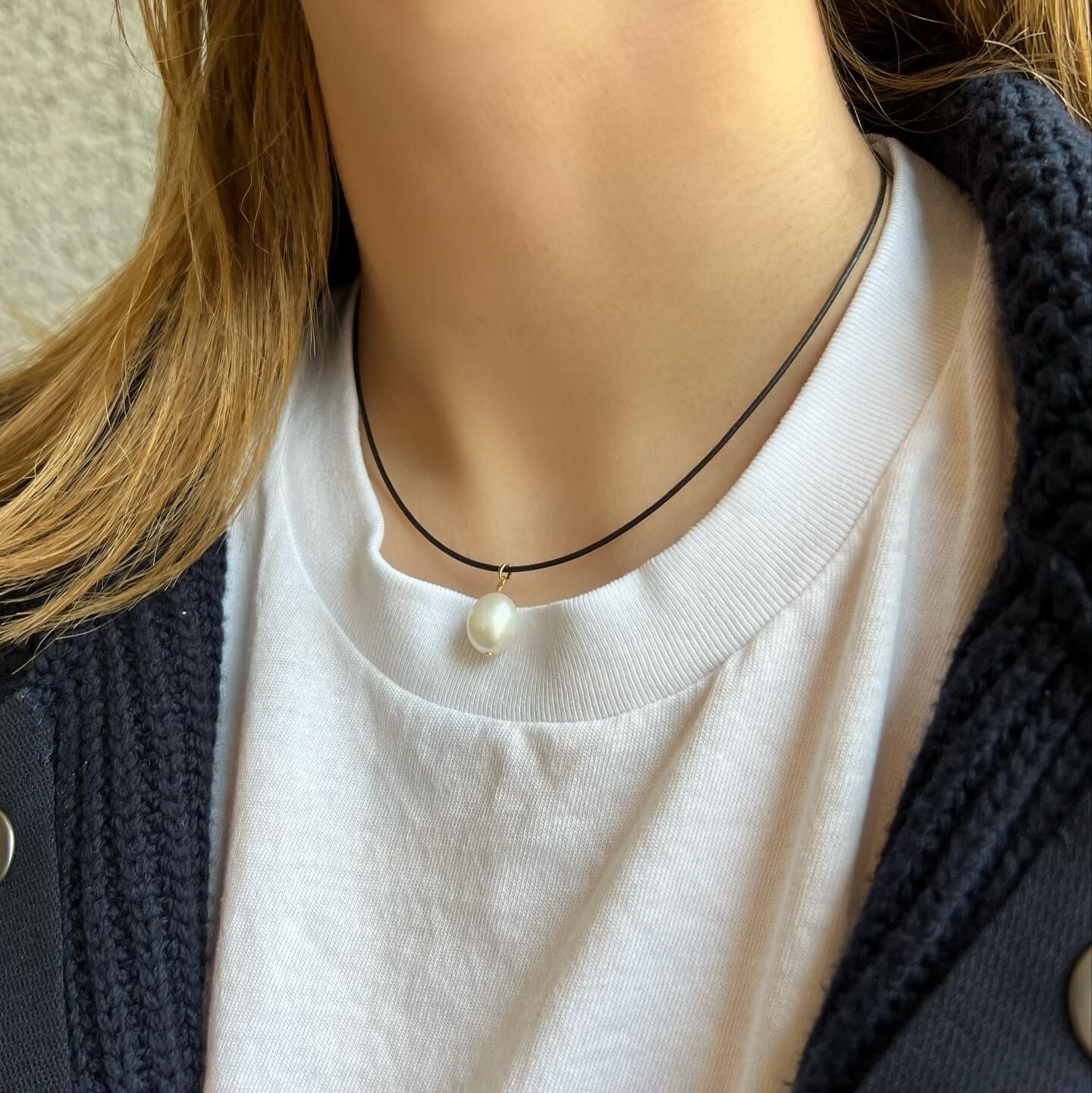 ダークブラウンのレザーと淡水パールの異素材の組み合わせがコーディネートのアクセントとなり、顔まわりを華やかに見せてくれます。