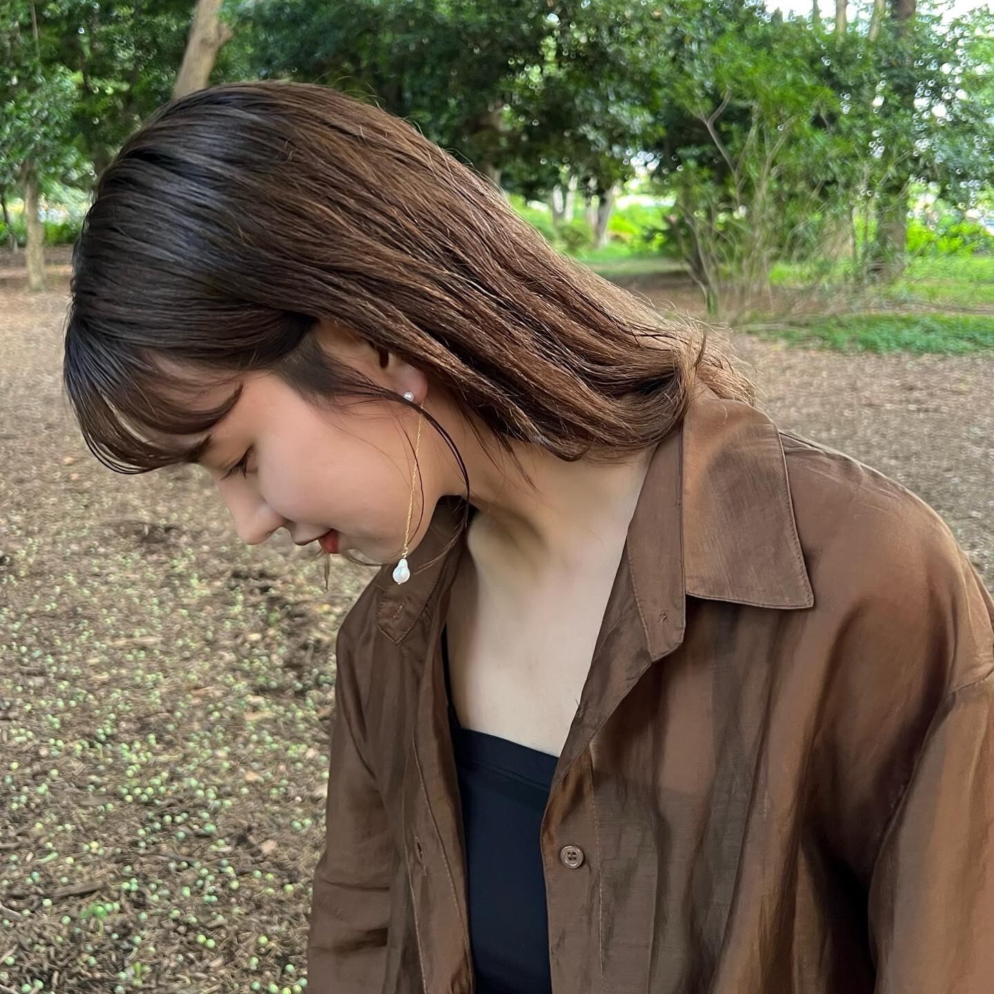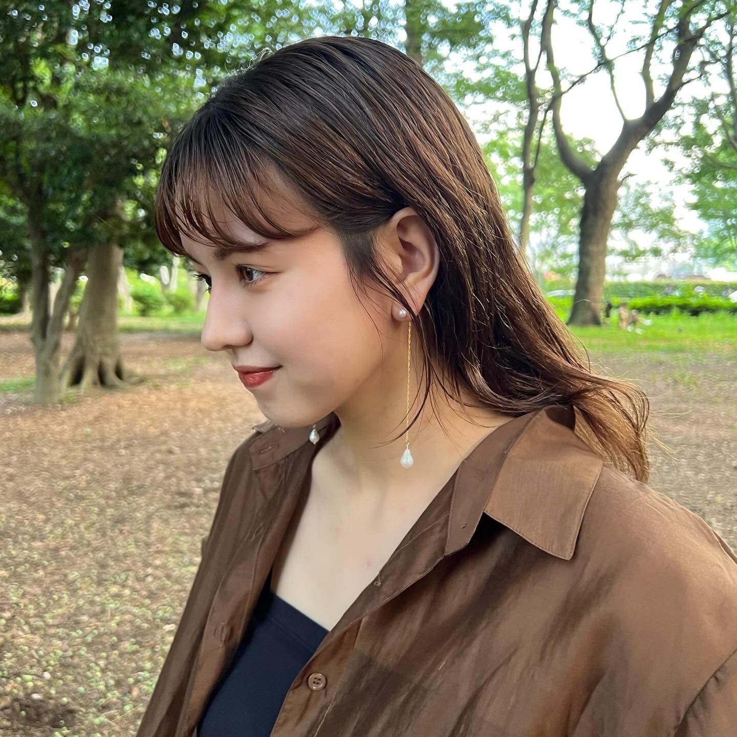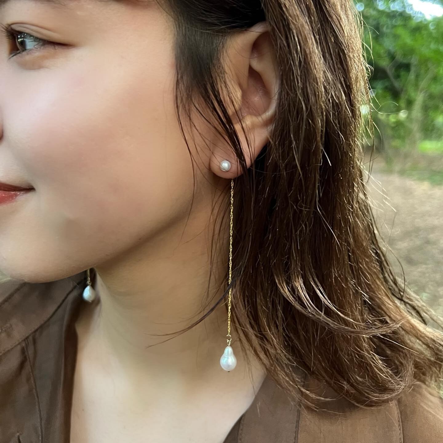 耳元はアクリル製のプチパール、華奢なチェーンの下にはテリが美しく、ちょうどいいサイズ感の淡水パールが揺れるデザインとなっております。
