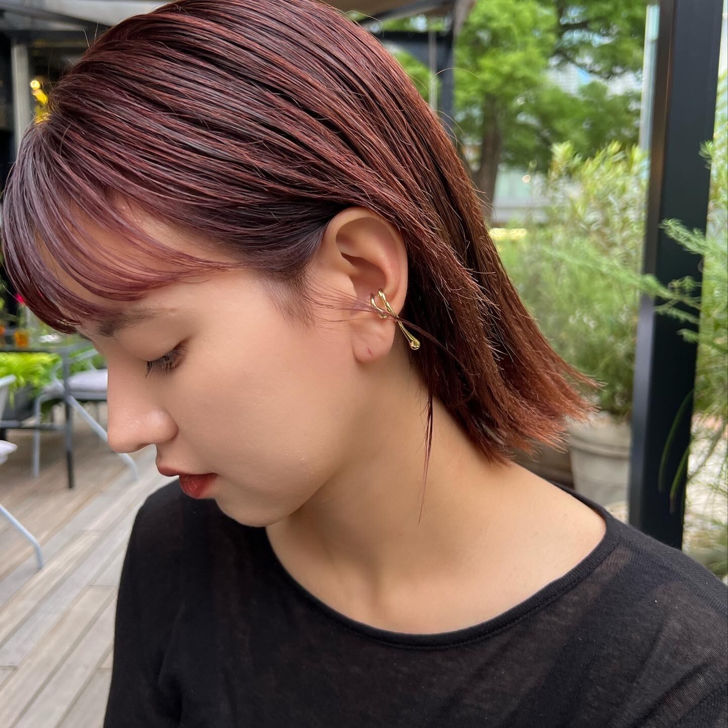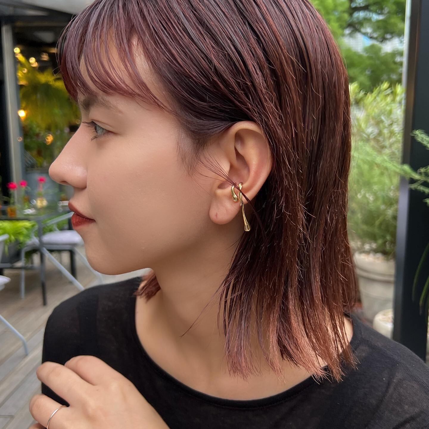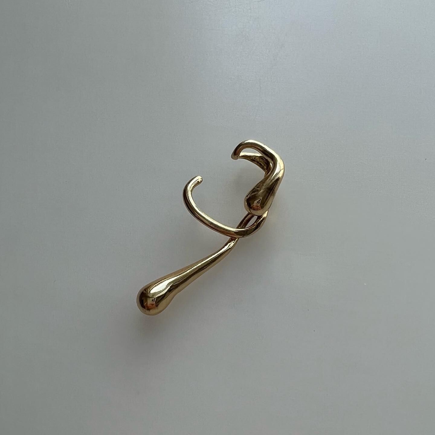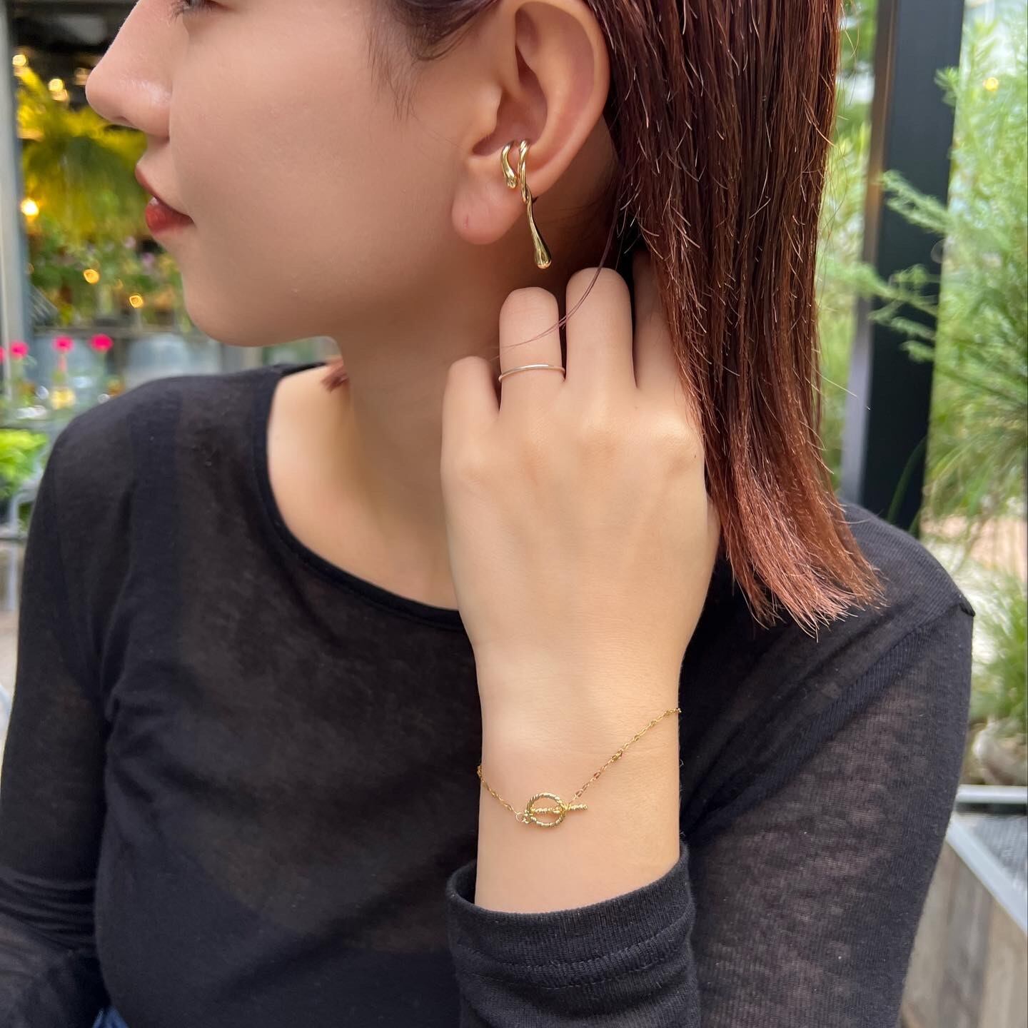 金の雫が垂れ落ちるようなシルエットと、耳に絡みつくようなねじれを加えたデザインは唯一無二の印象になります。
