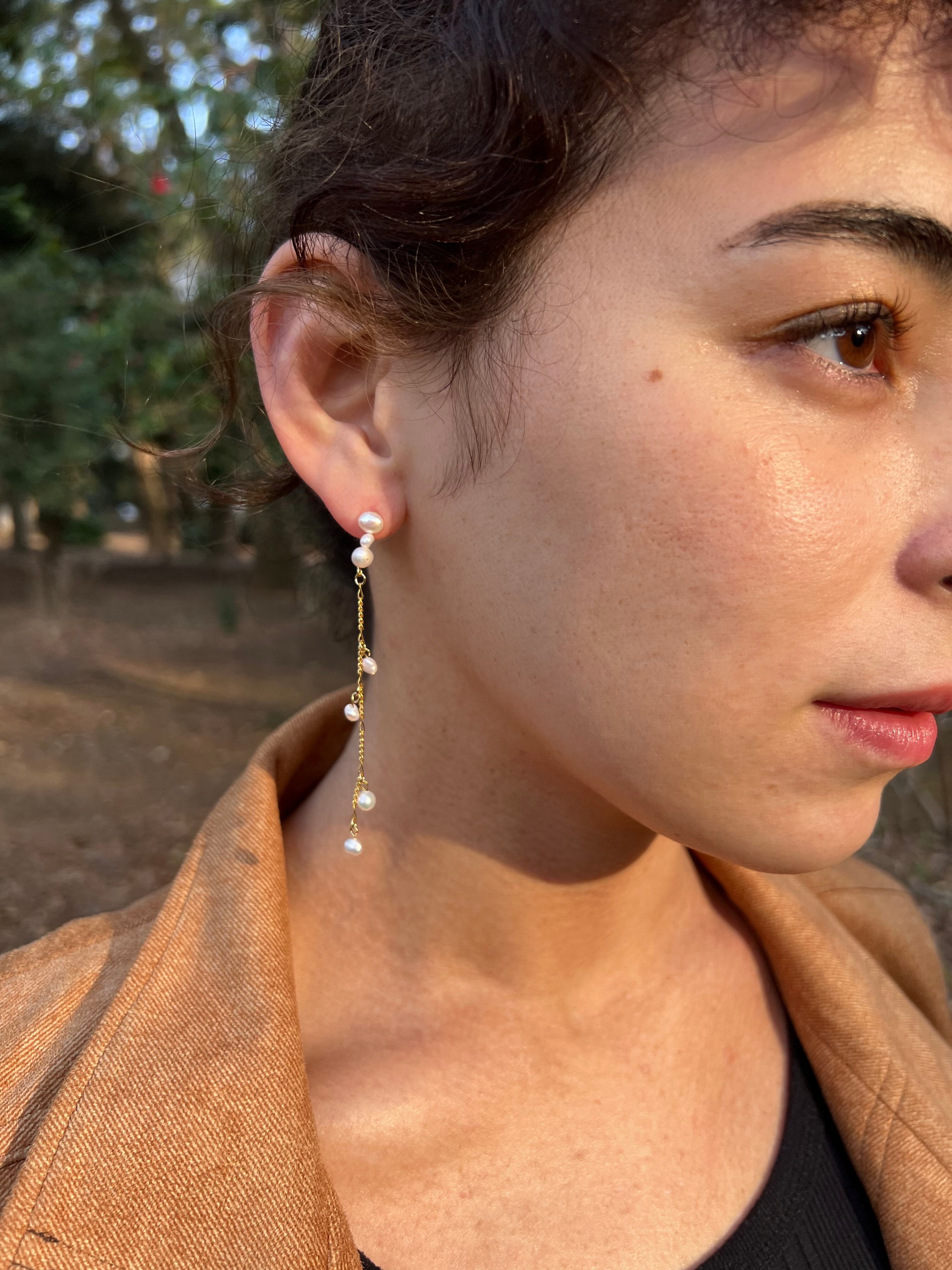 耳から首筋にかけて垂れ下がるデザインで、動くたびにさりげなく揺れ、女性らしい印象を与えてくれます。