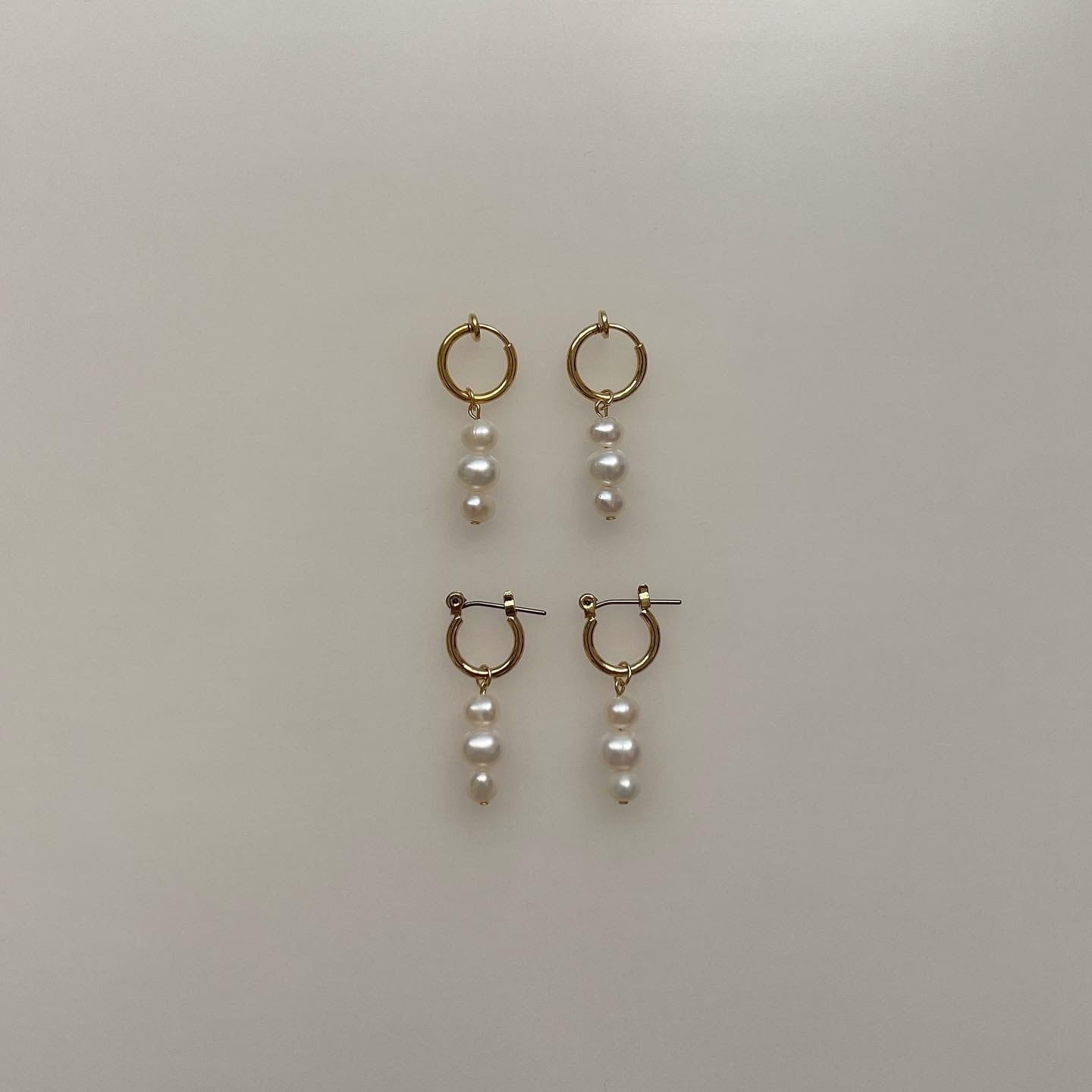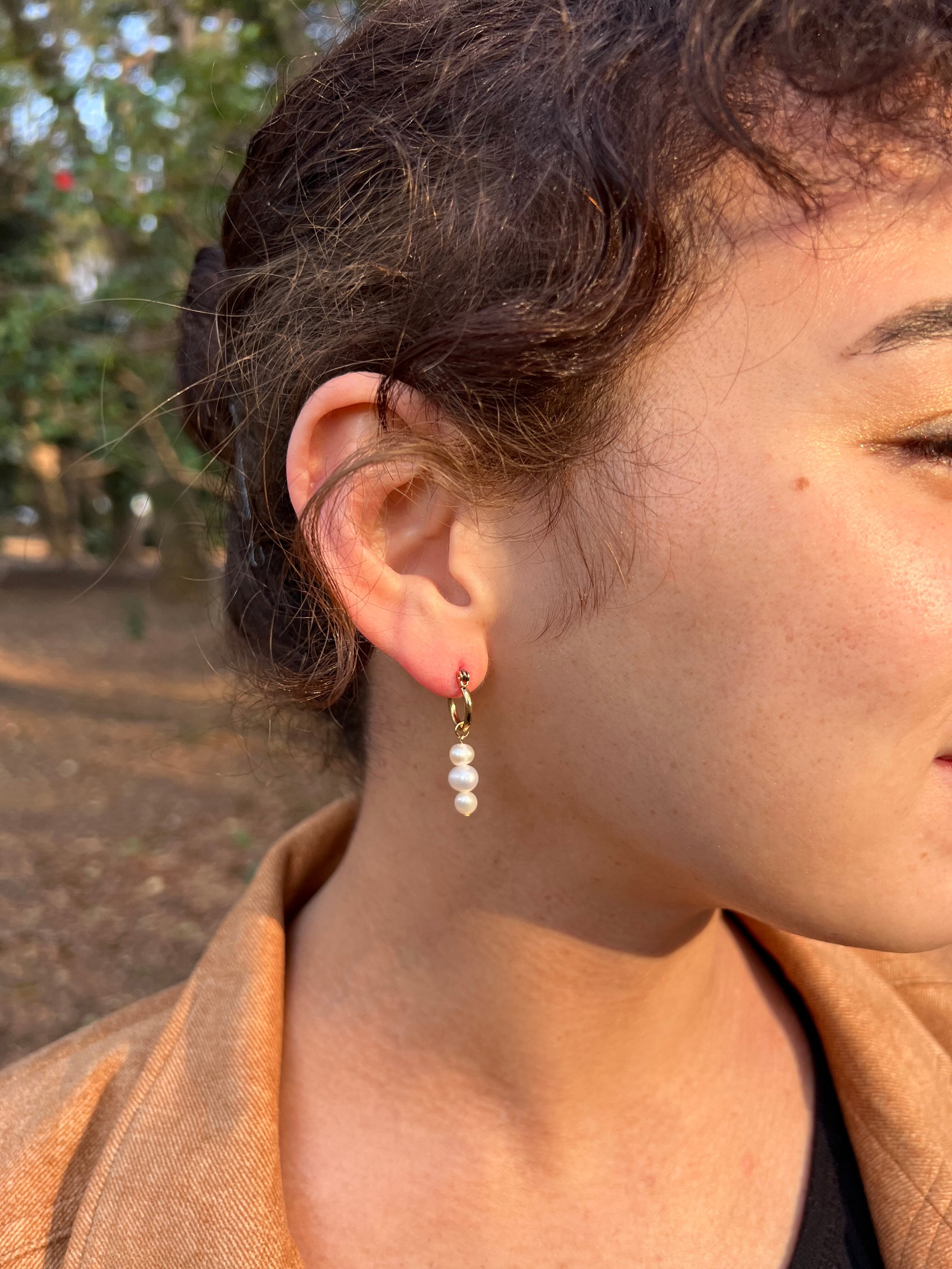 上下と真ん中で淡水パールのサイズ感に差をつけ、より動きのあるデザインに仕上げました。