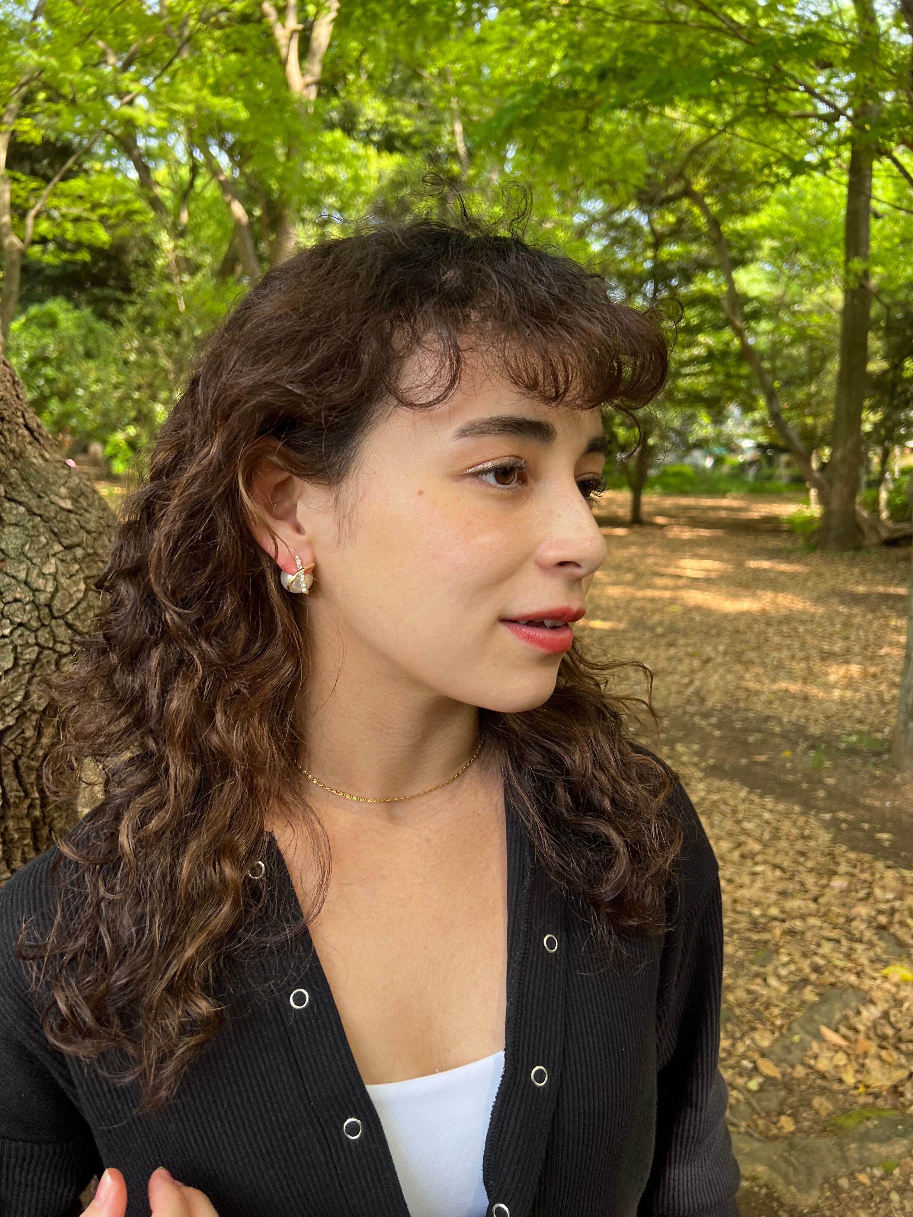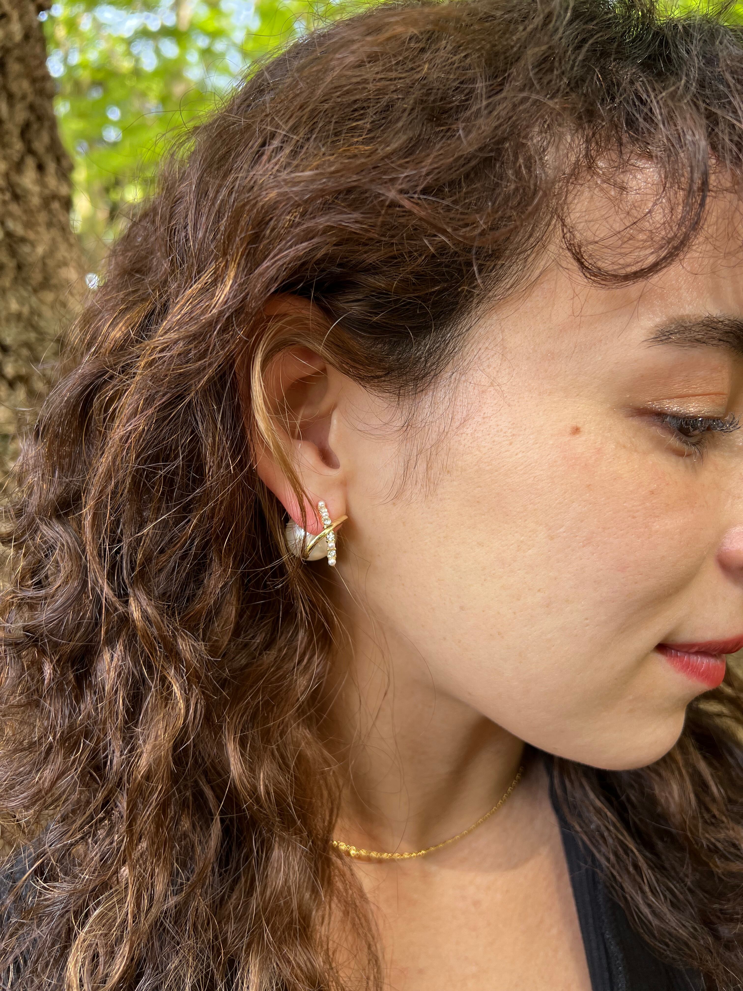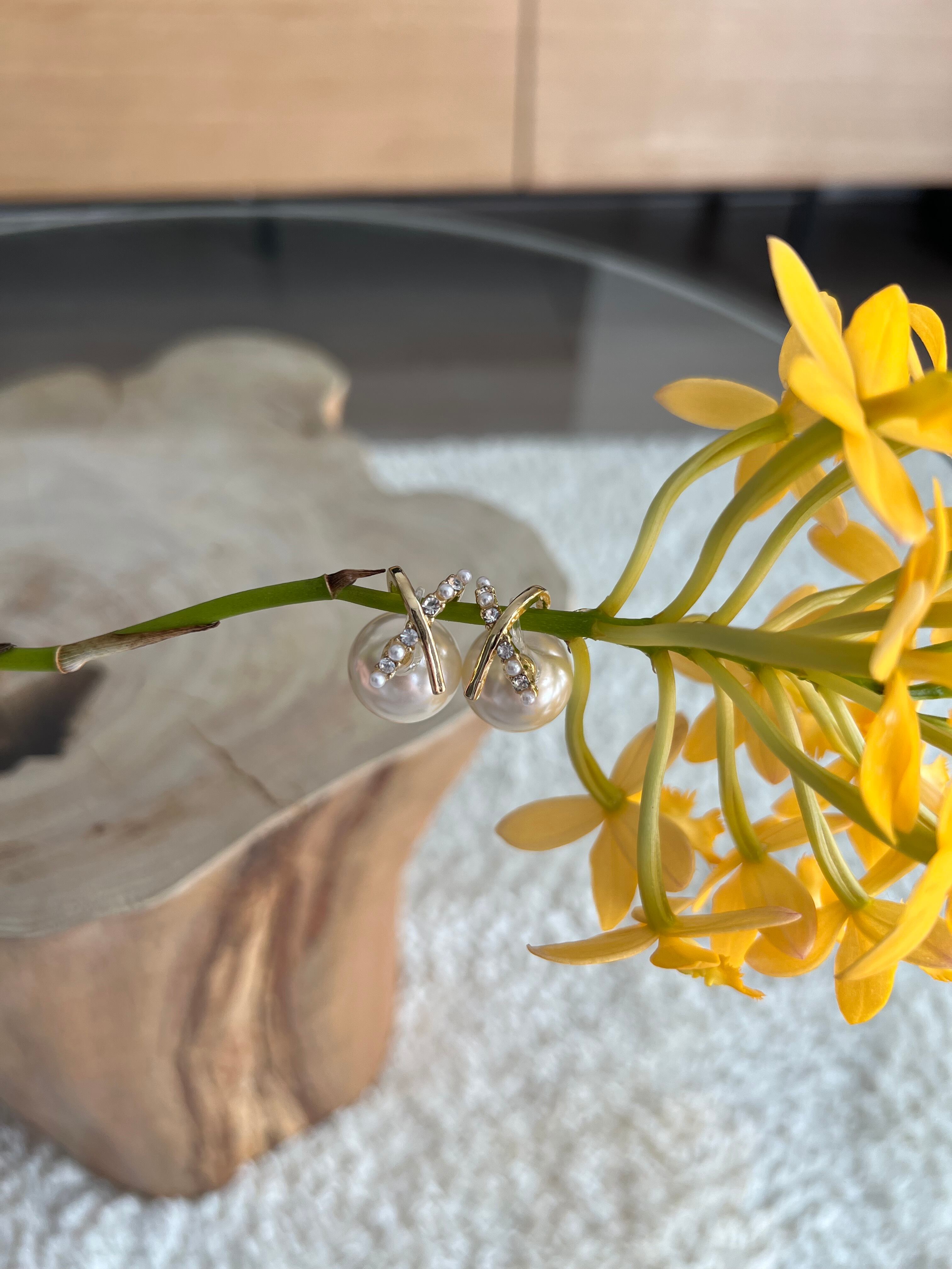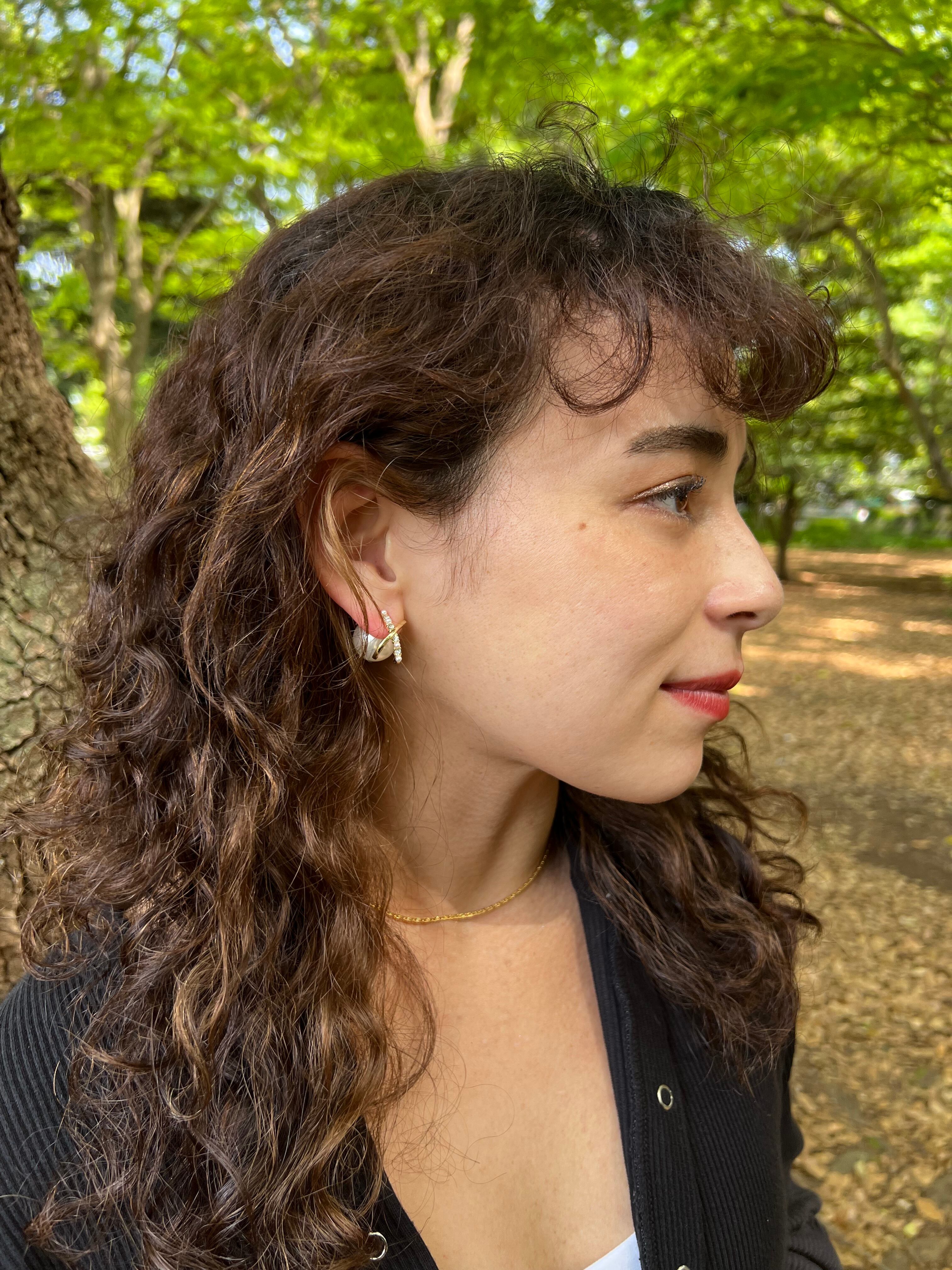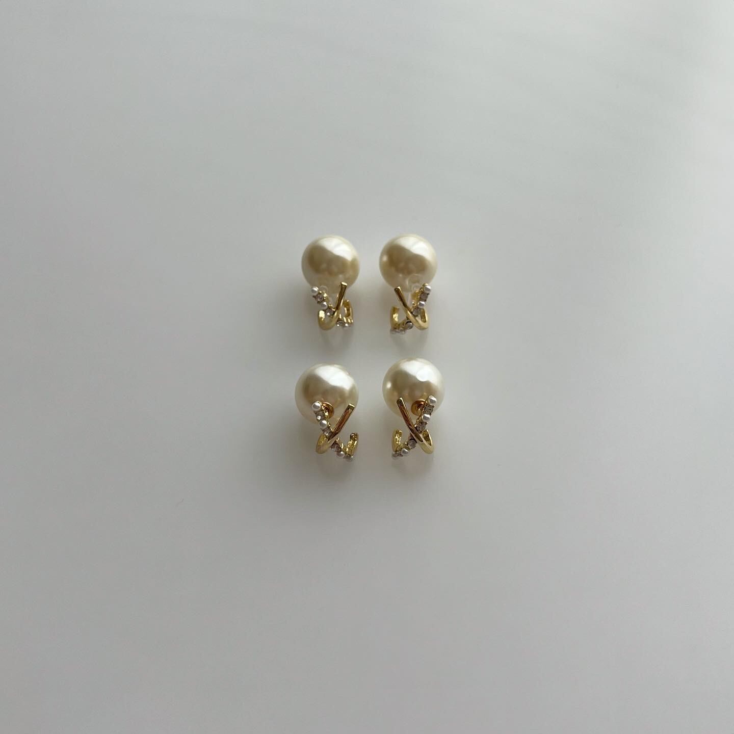 フロント部分はゴールドとスワロフスキーがクロスされた華奢なデザインになっており、その隙間から見えるバックのパールが綺麗めな印象を与えてくれます。