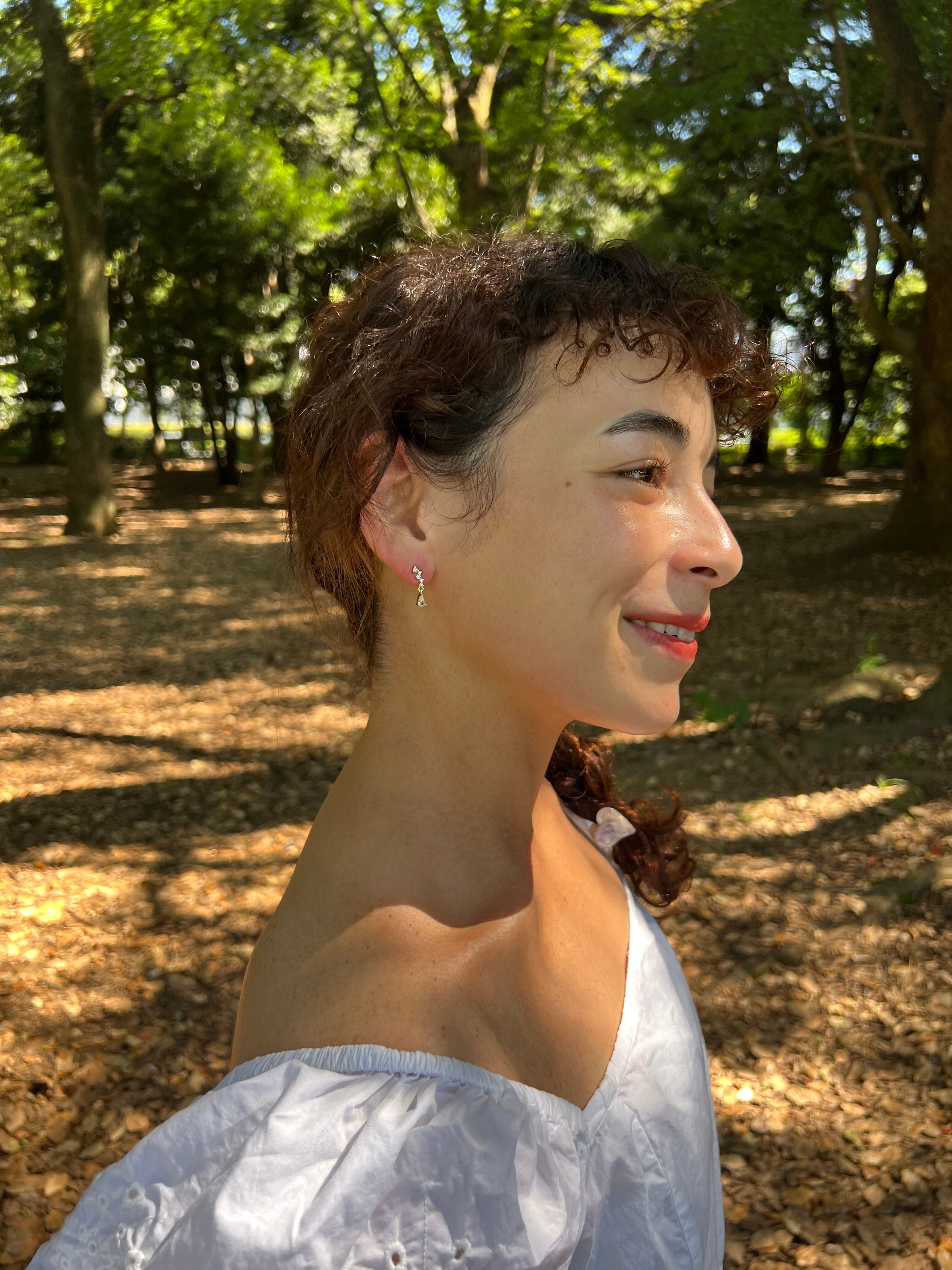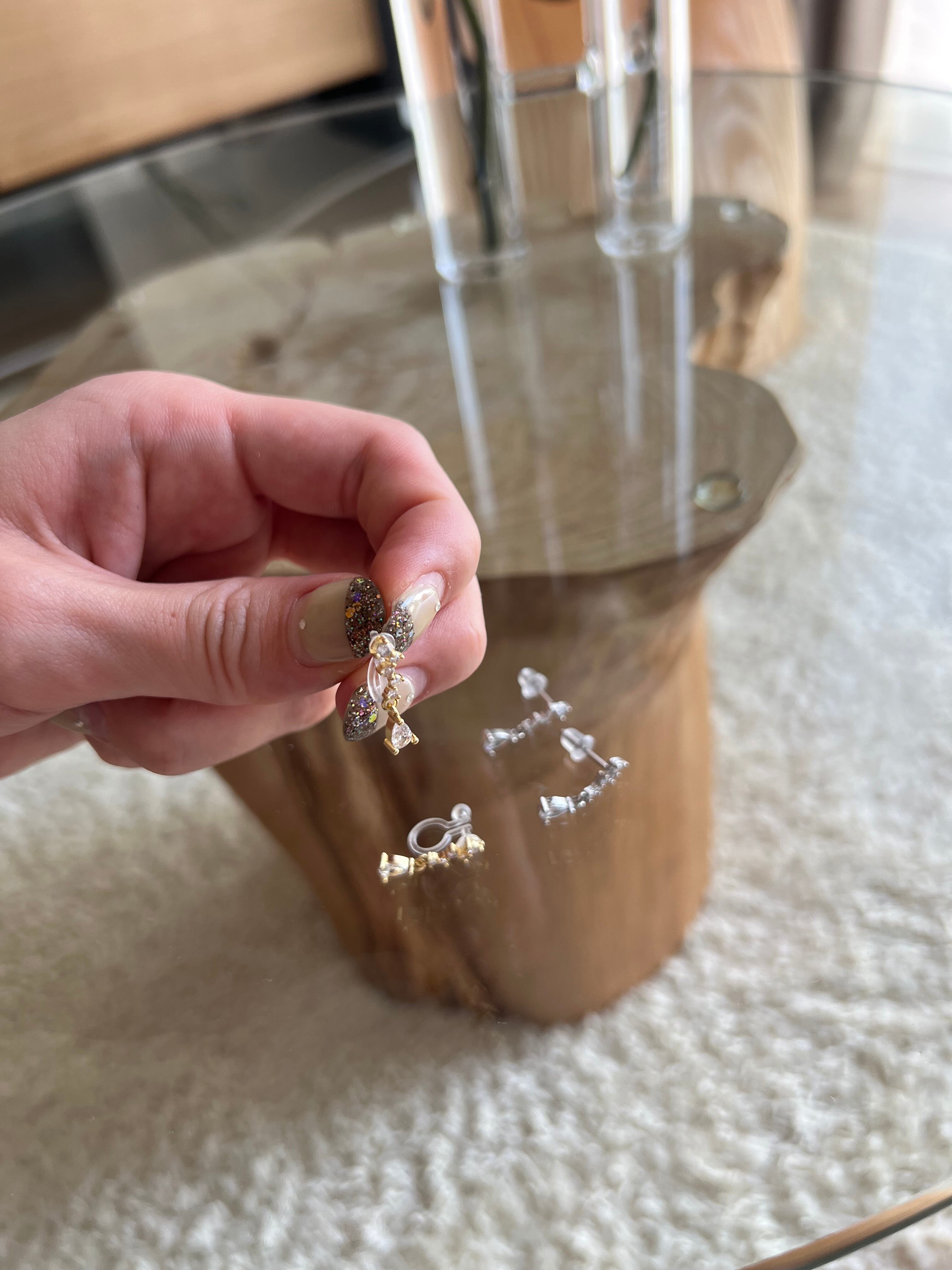 耳たぶにピタッと収まり、下のクリスタルが気持ちばかり揺れ上品な印象に。