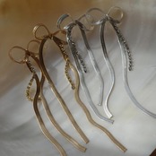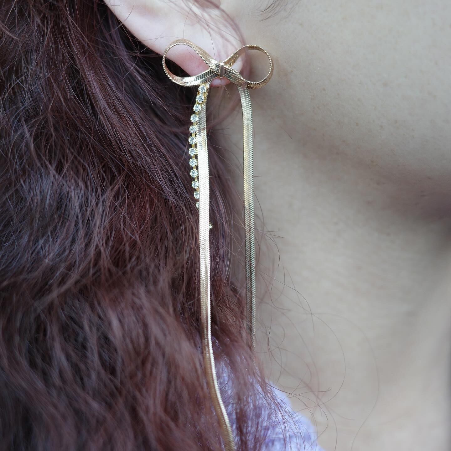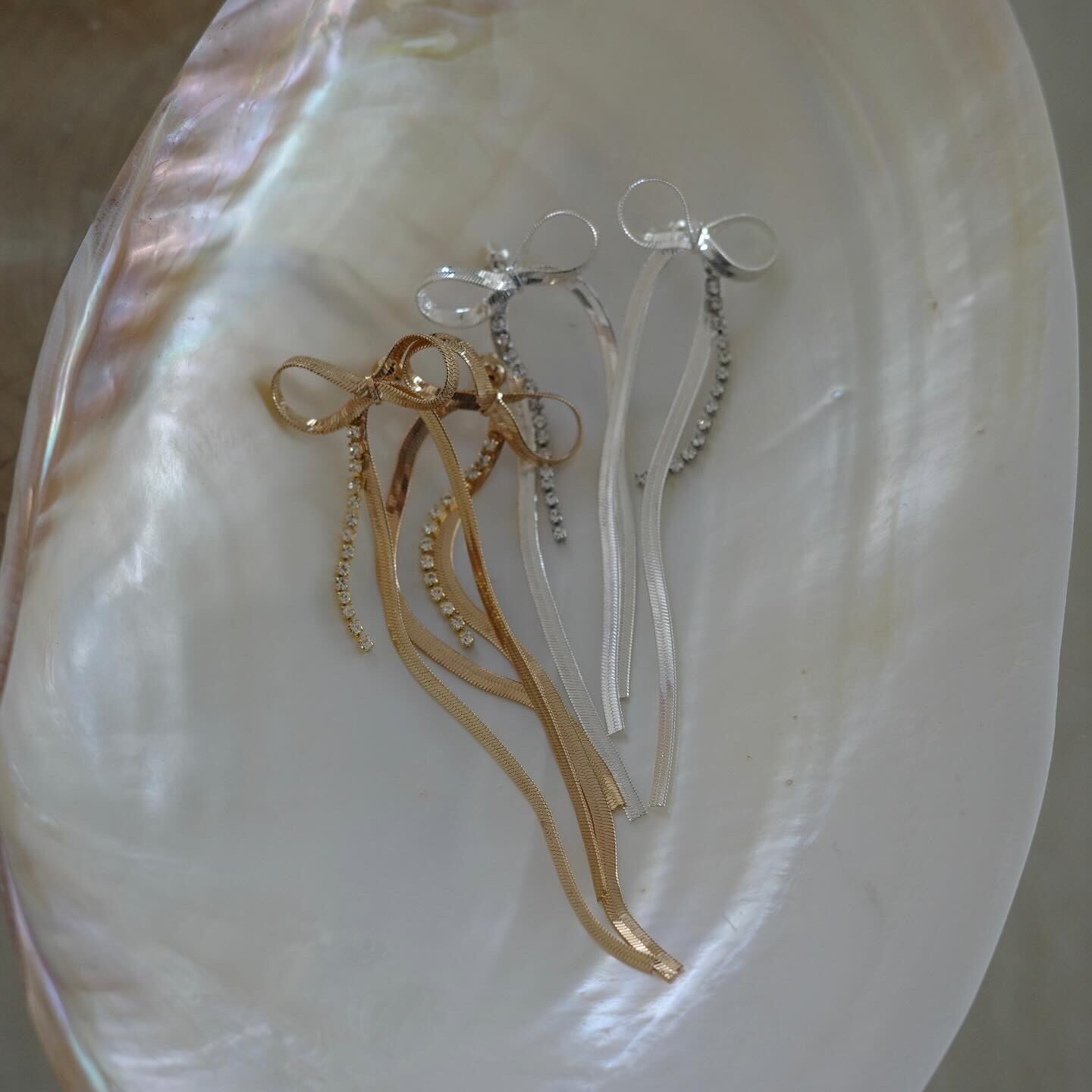 シンプルなチェーンで作ったリボンに、きらっと輝くラインストーンのチェーンをプラスし、アクセントを加えました。