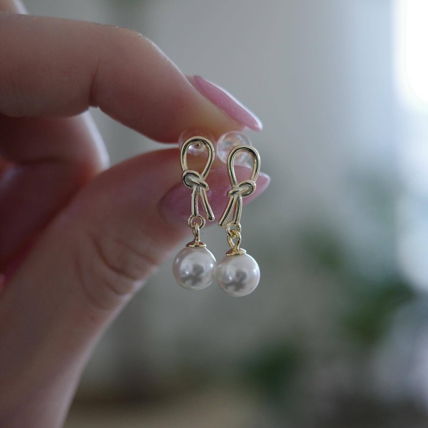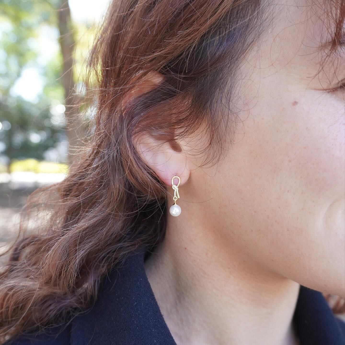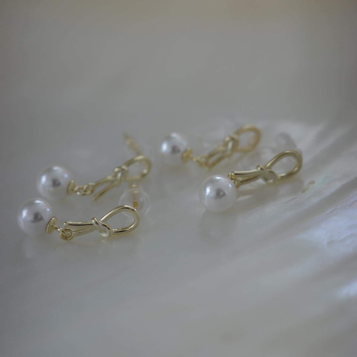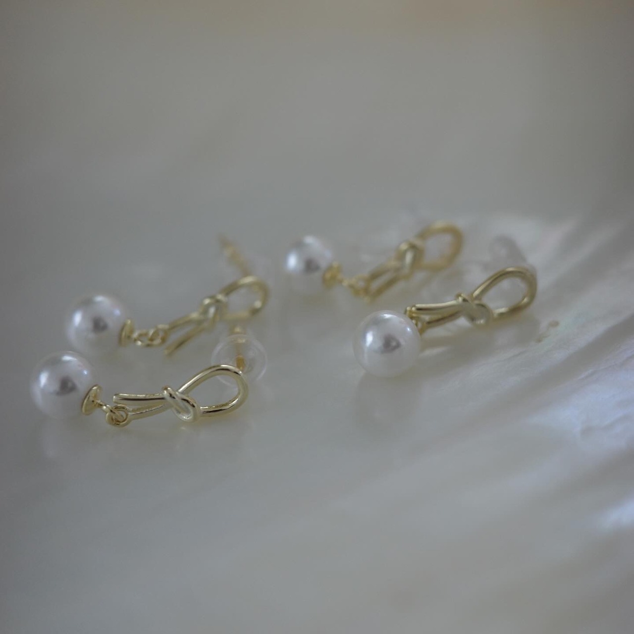 華奢な結び目とぷっくりパールを組み合わせたミニサイズのアクセサリー。