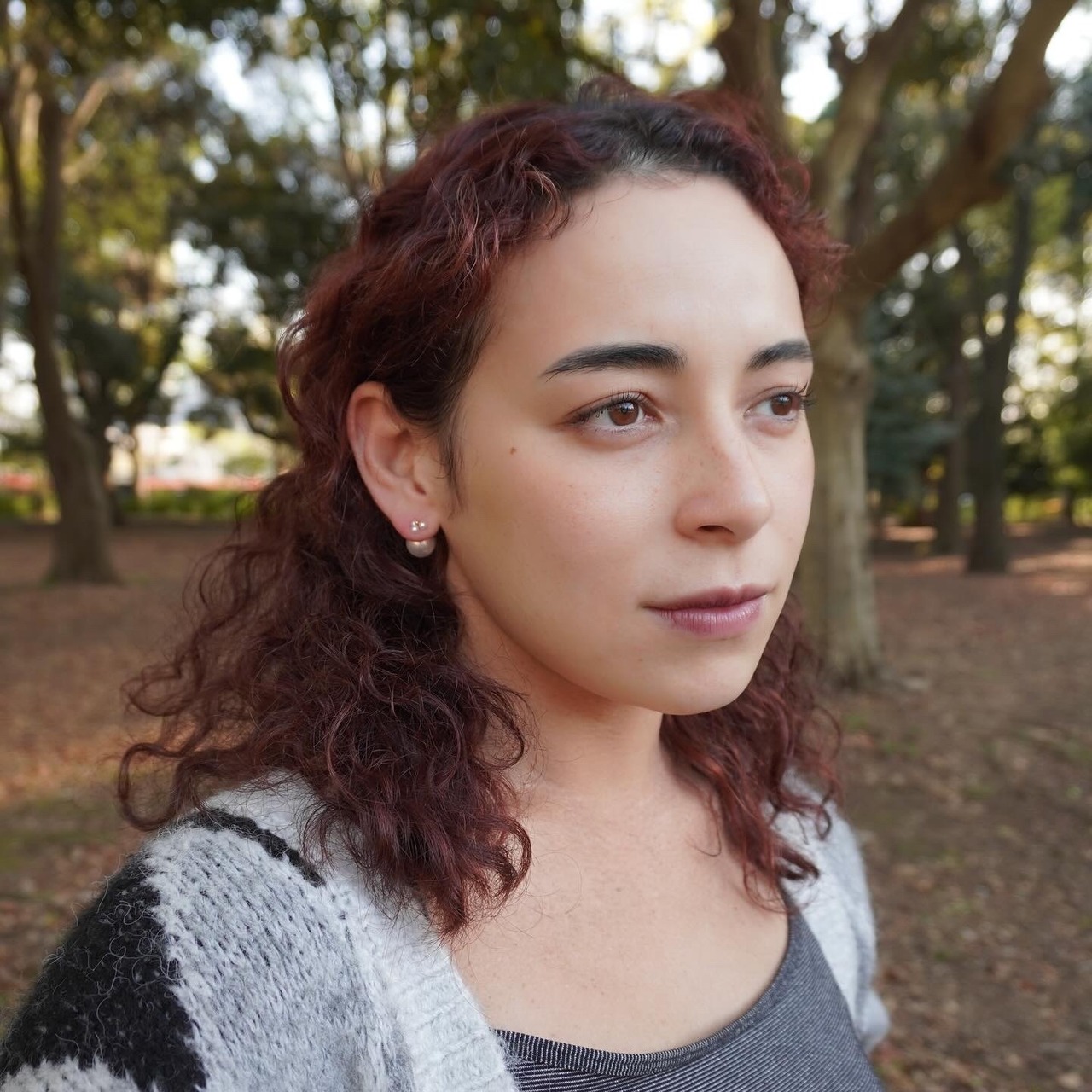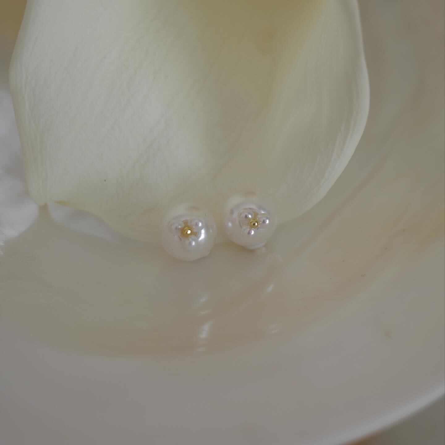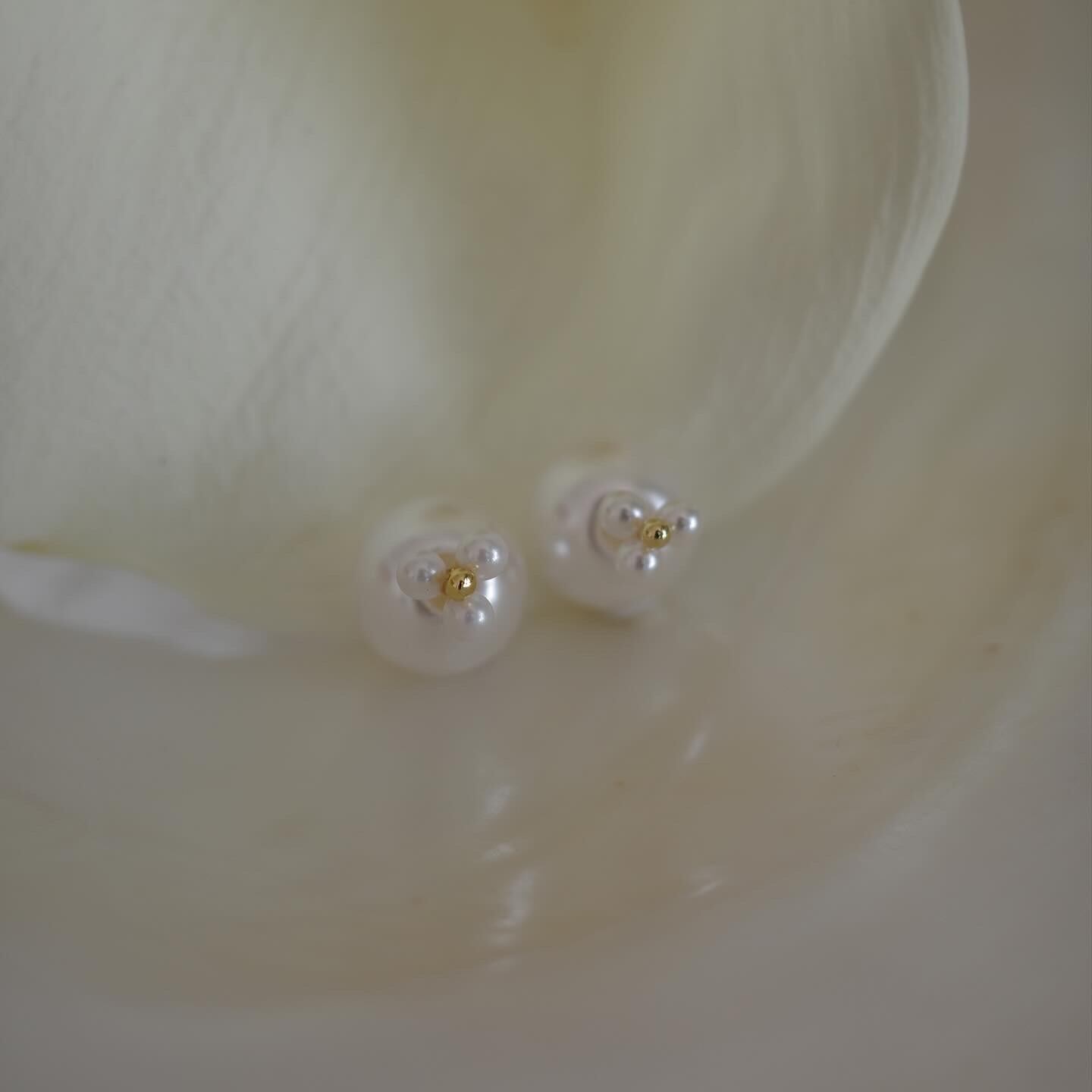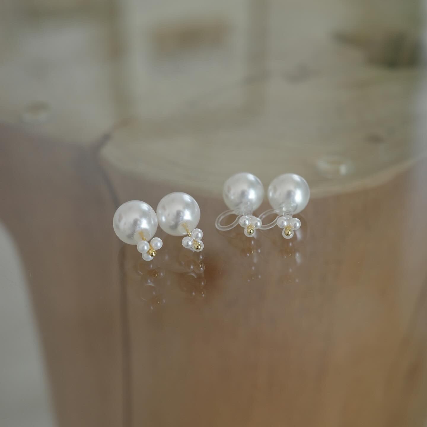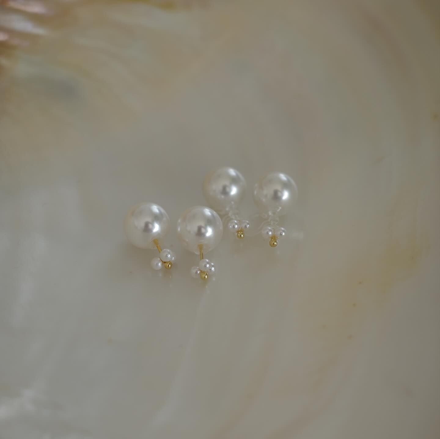 正面にはプチサイズのパールを並べ、お花のモチーフを作りました。後ろ側には大きめのパールを採用し、前後のアクセントが際立つシルエットに仕上げております。