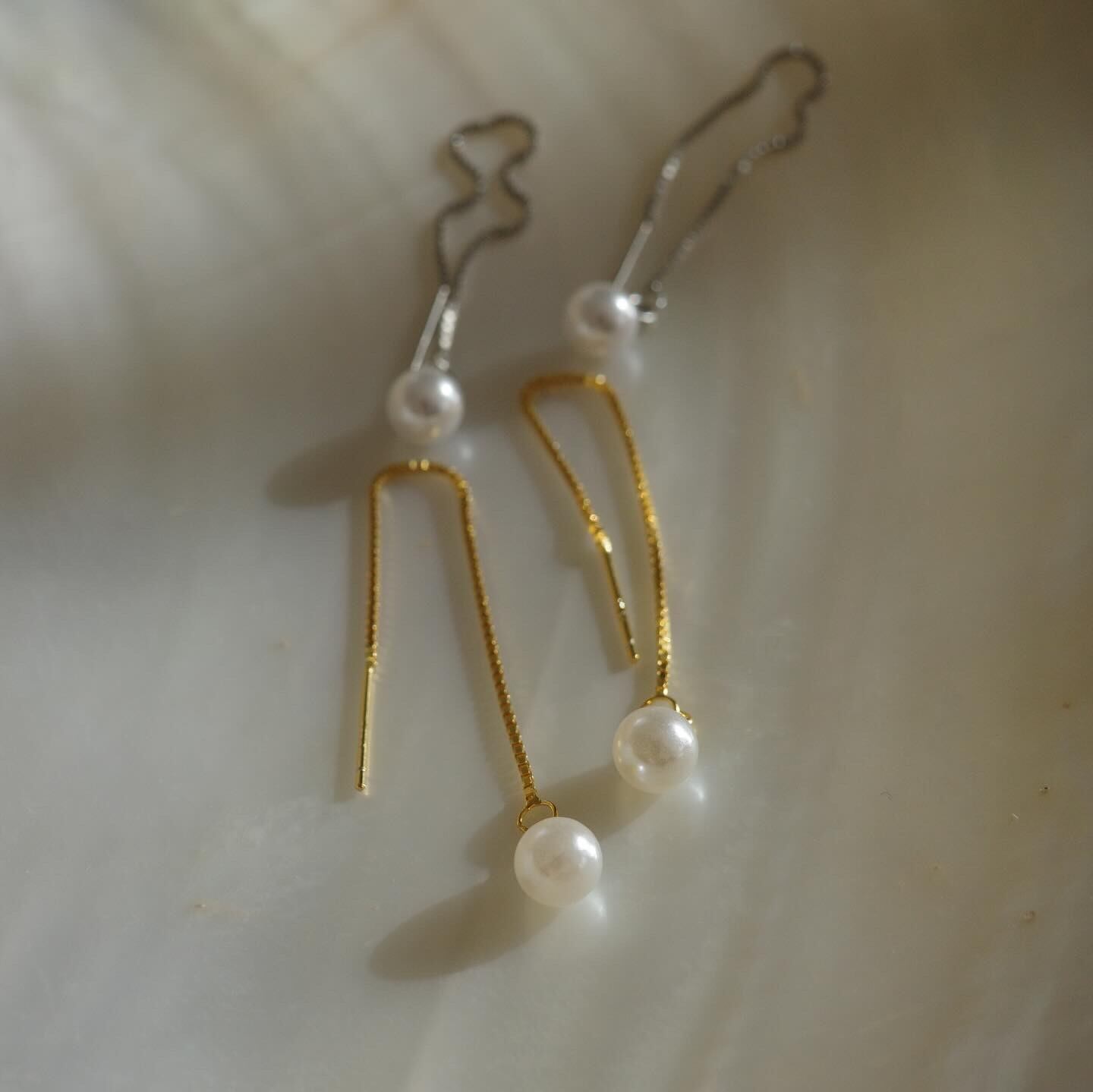 ピアスはパールを垂れ下げても良いですし、耳たぶに寄せてもお使いいただけ、様々な表情を見せてくれます。