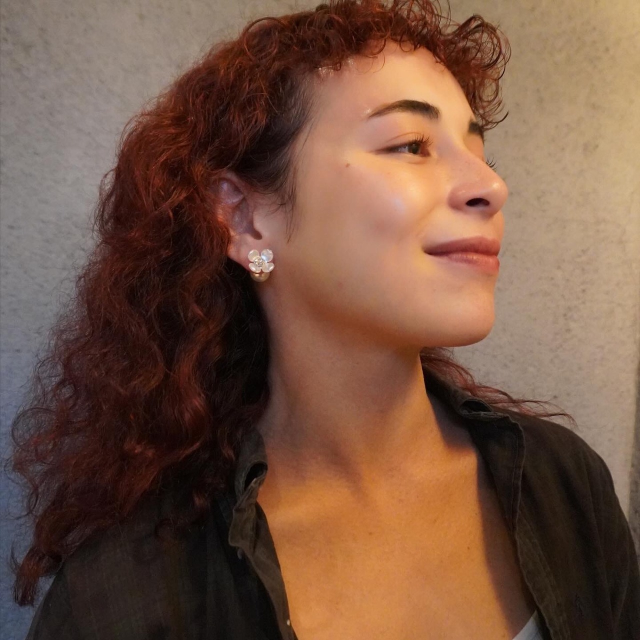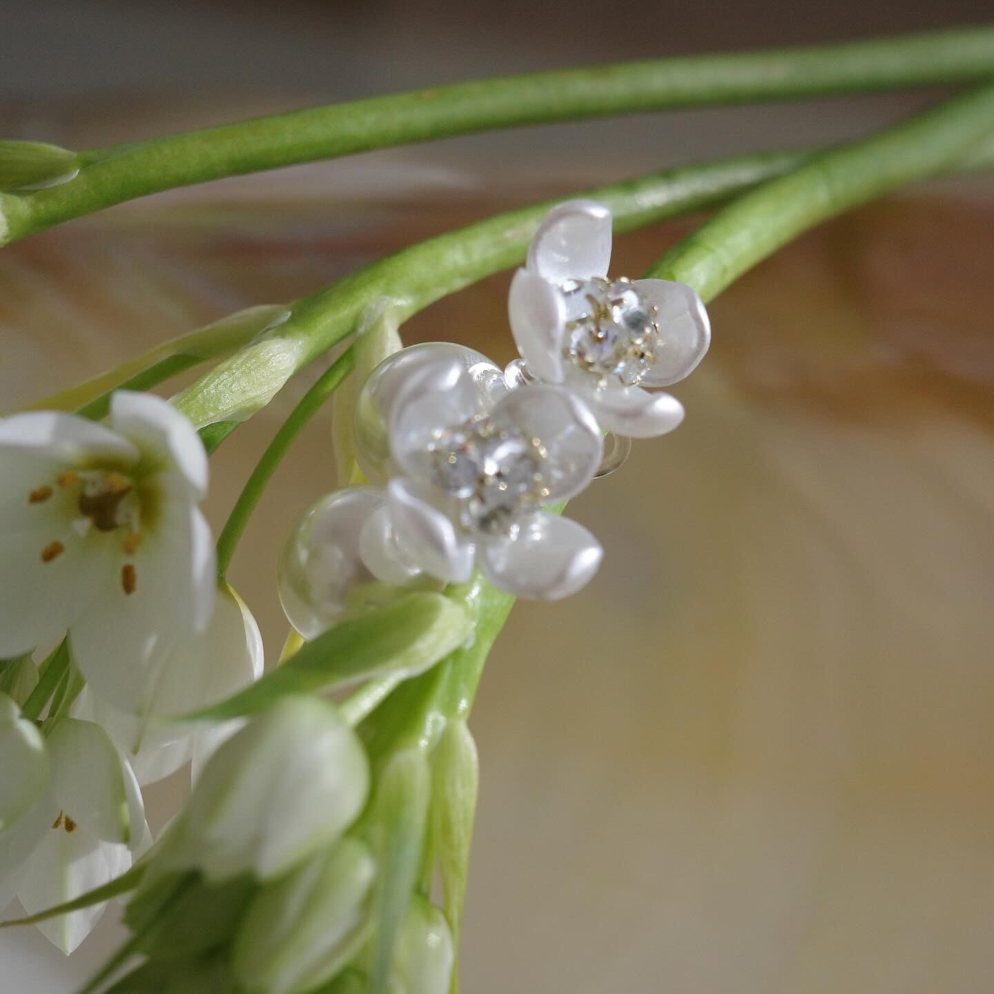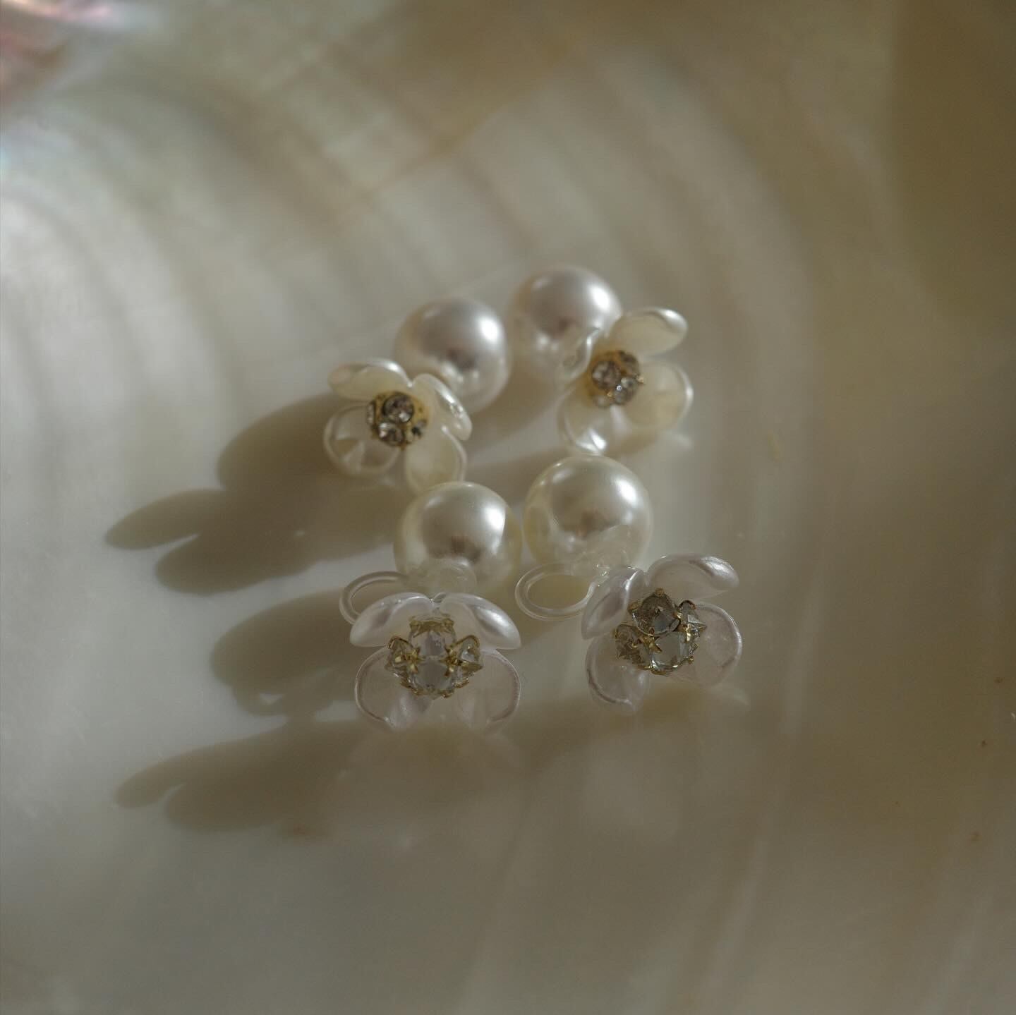 キャッチ部分は大ぶりのパールを使用し、ぽってりとした可愛らしさの中にも上品さが残るお花のアイテムです。
