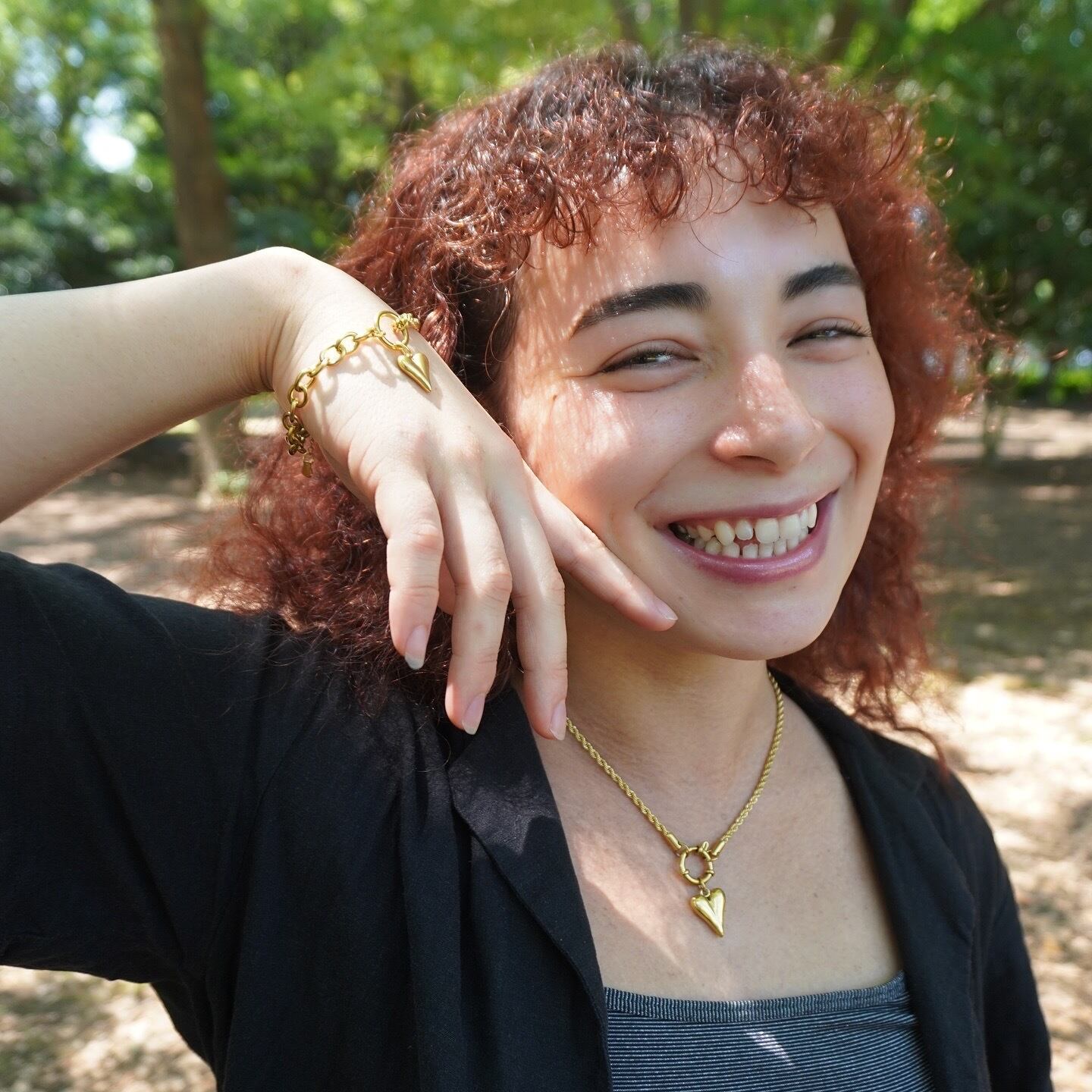 ブレスレットにはハートが2つ付いており、さりげない可愛らしさもポイントです。