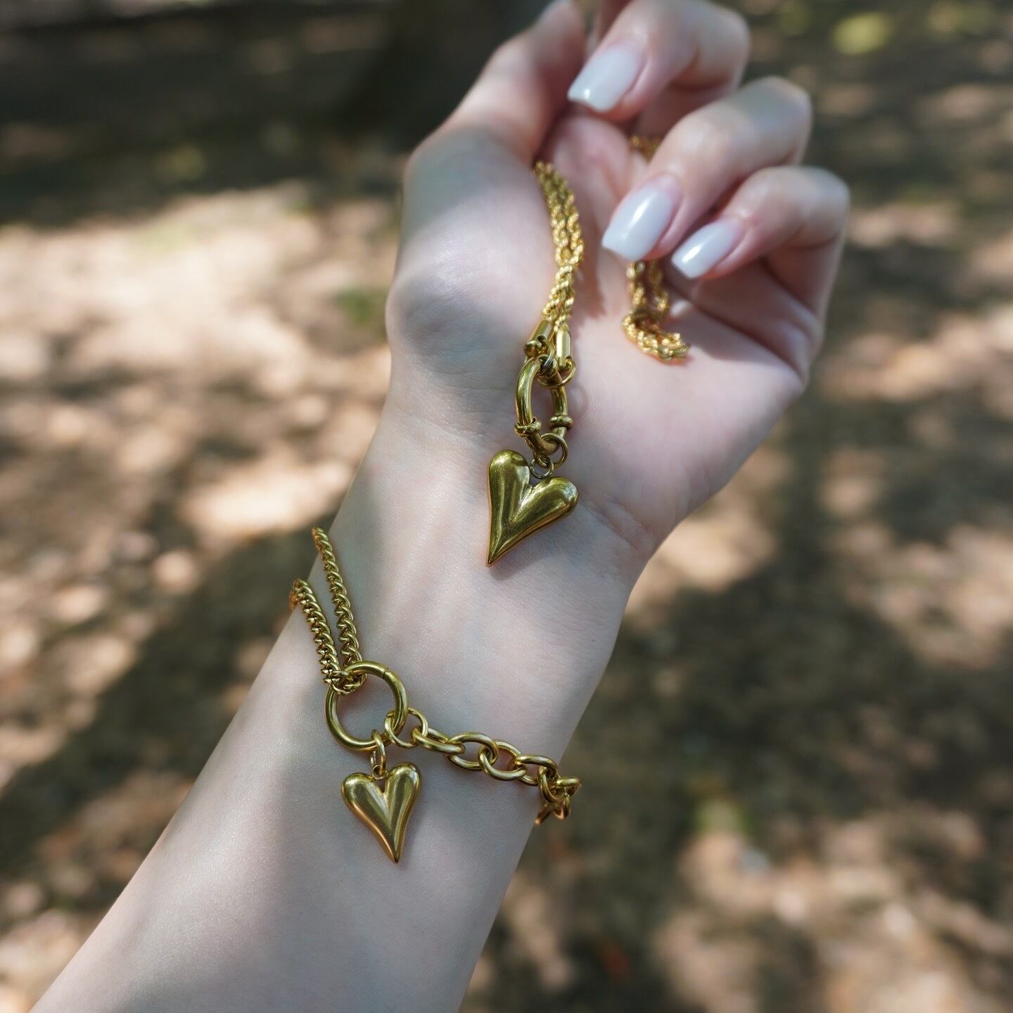 heart chain braceletと一緒にお召しいただいても統一感が出て印象的なコーデに仕上がります。