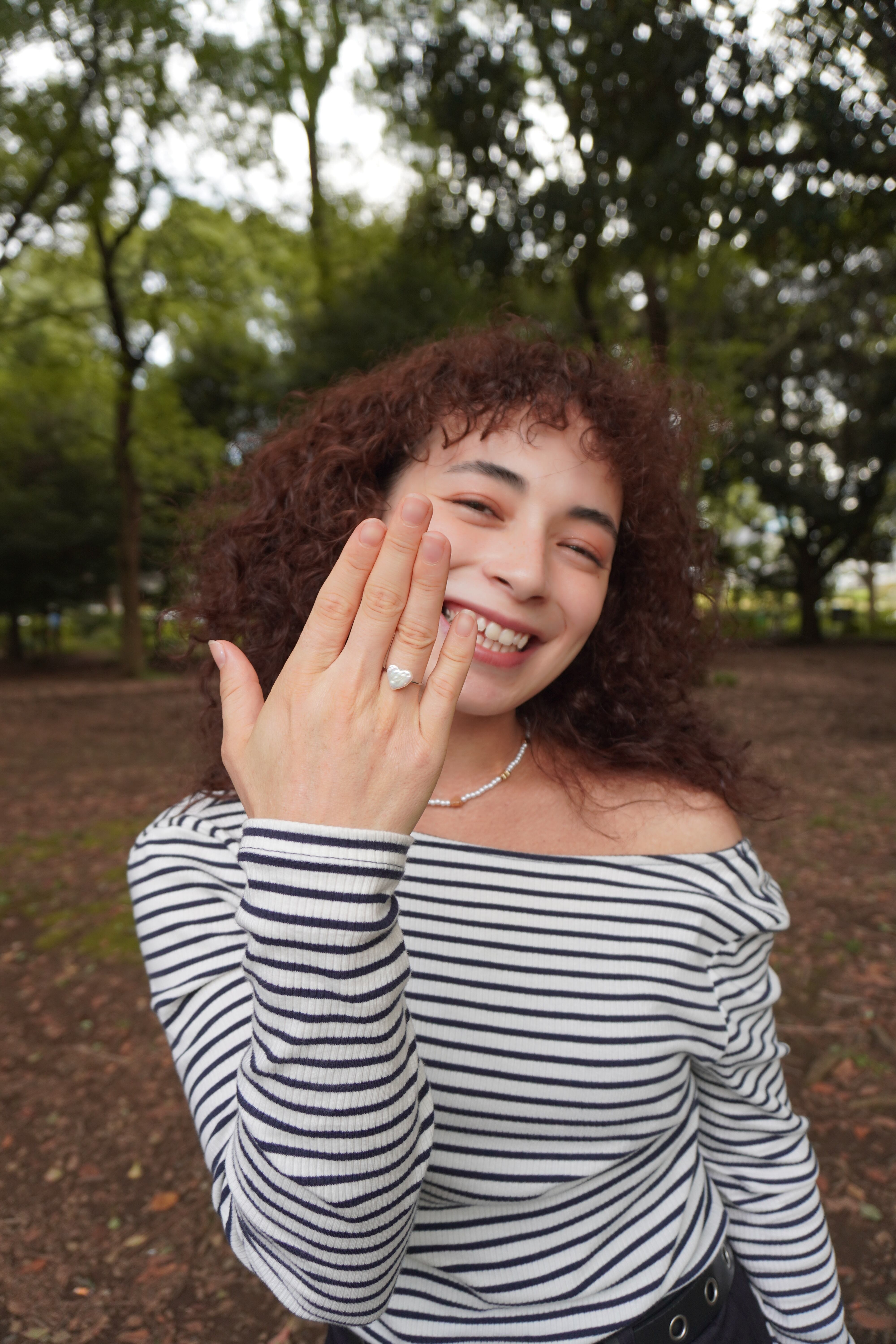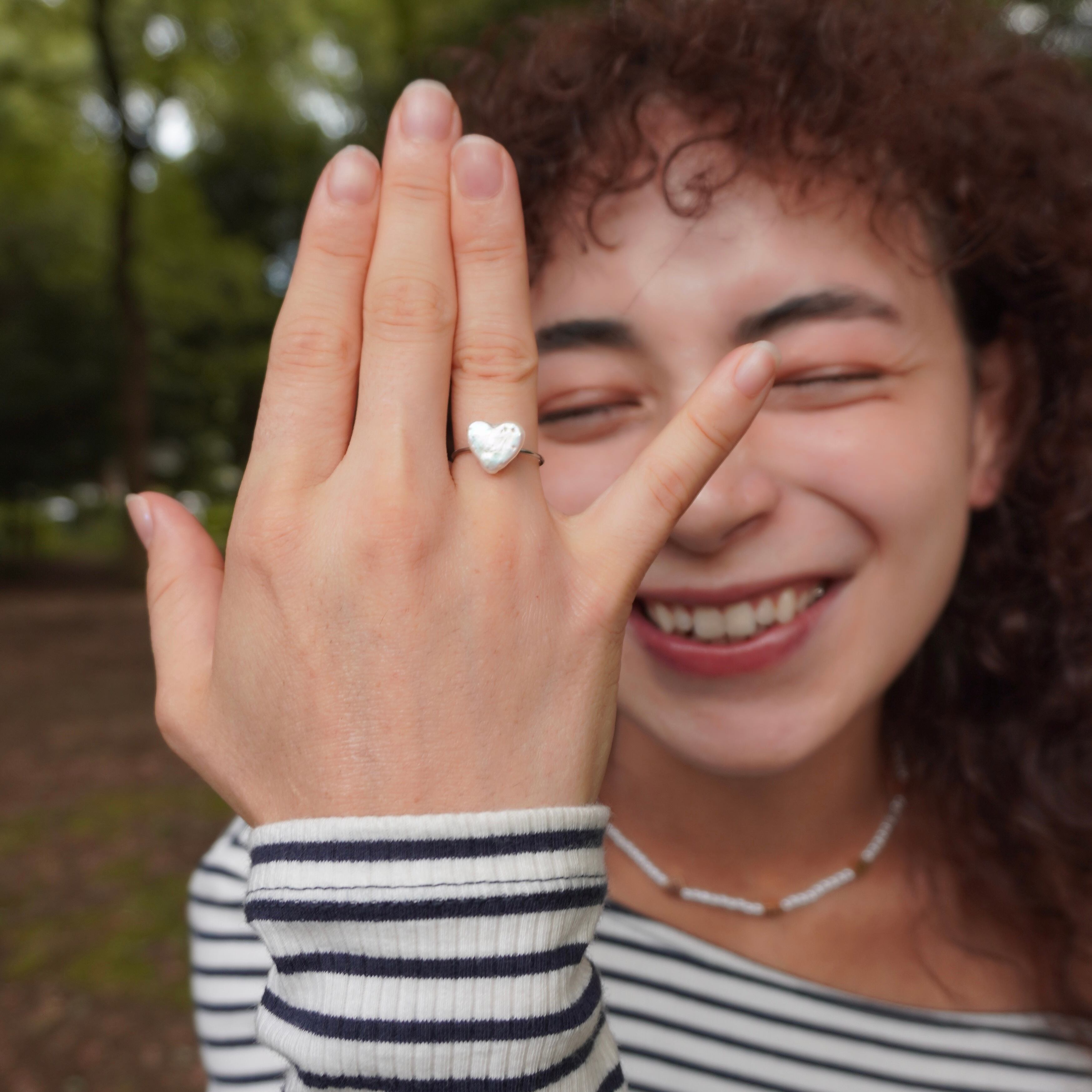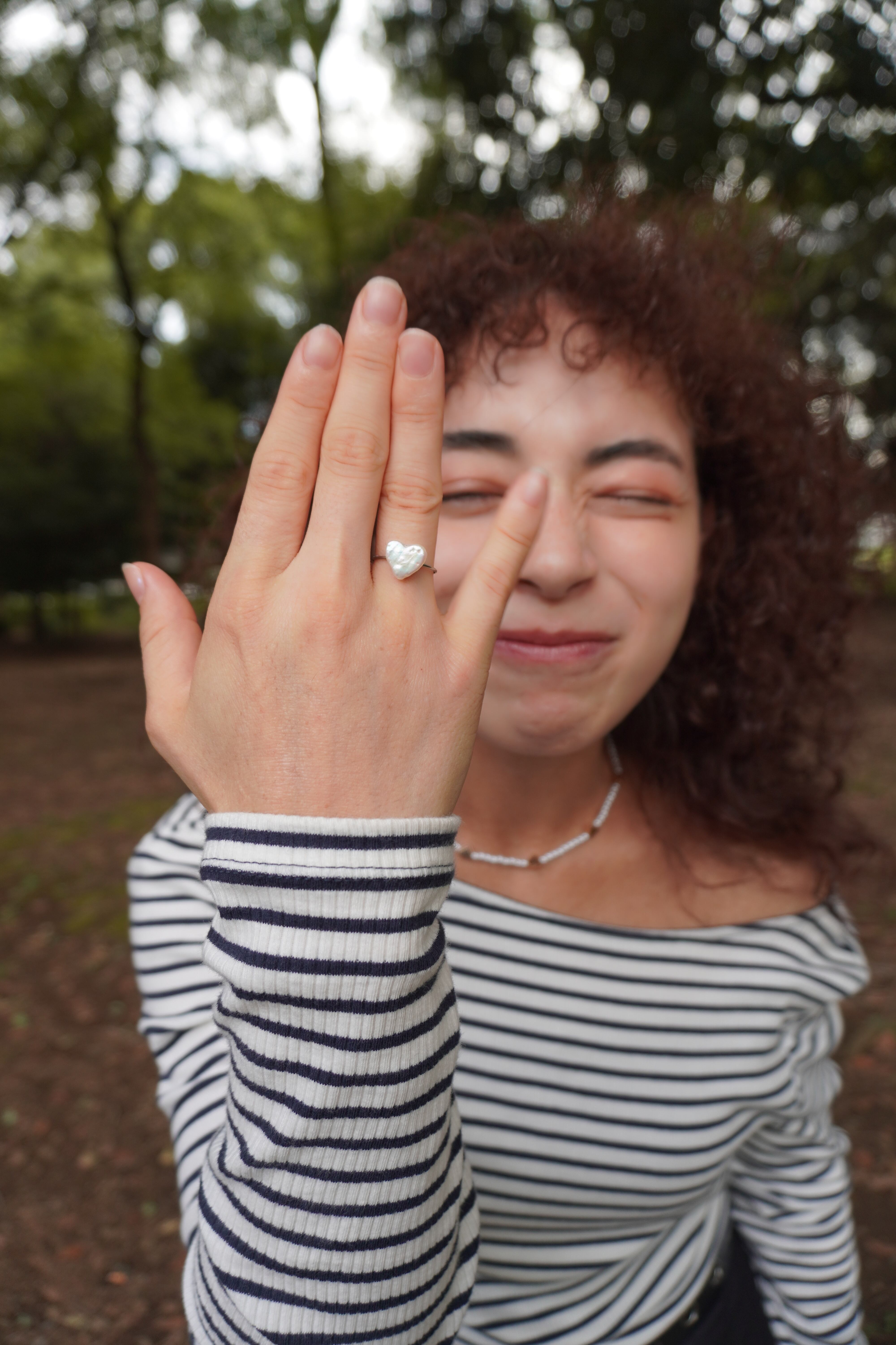 アンニュイな雰囲気がある柔らかいパールに、リング部分は華奢見えする細めのものを採用いたしました。