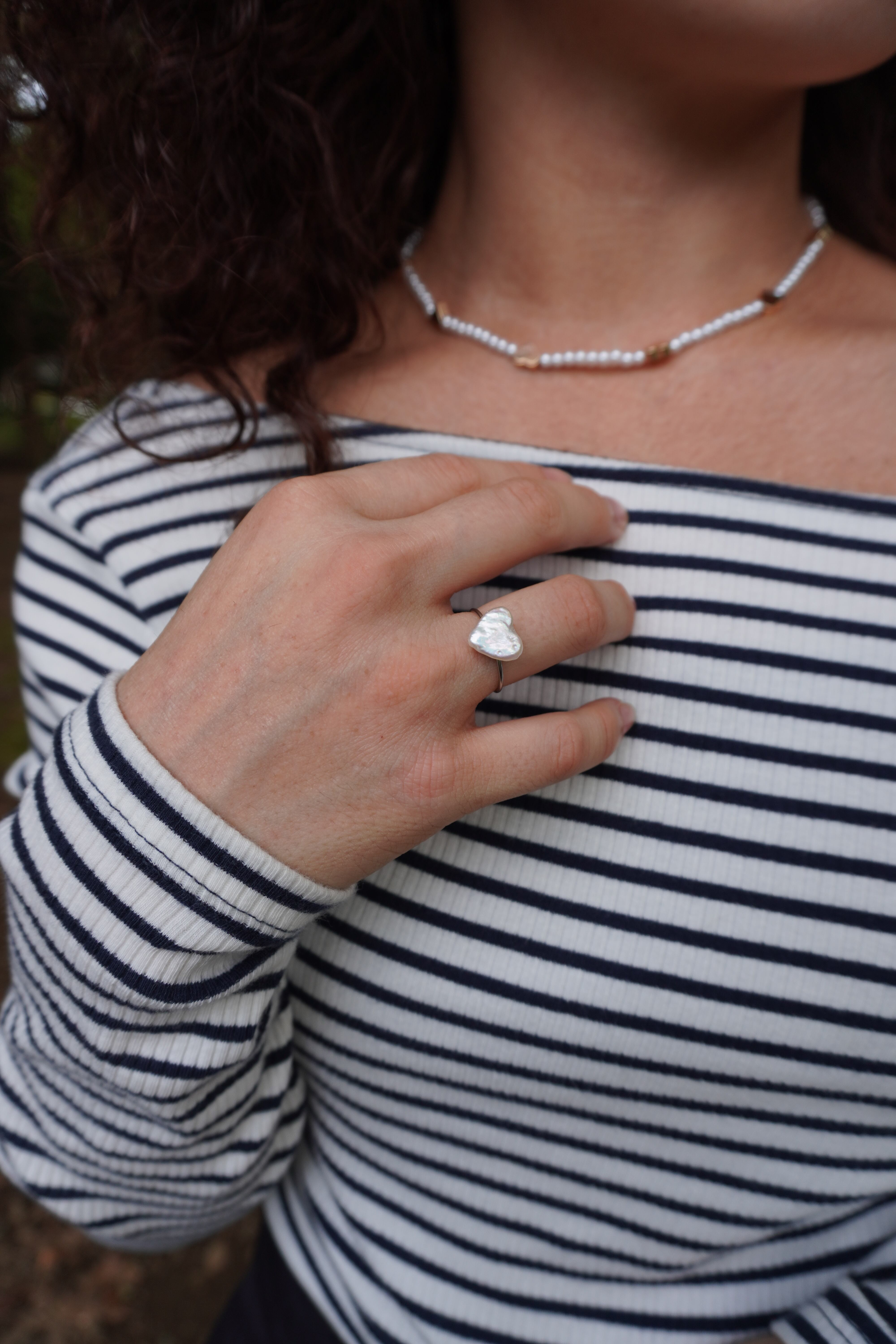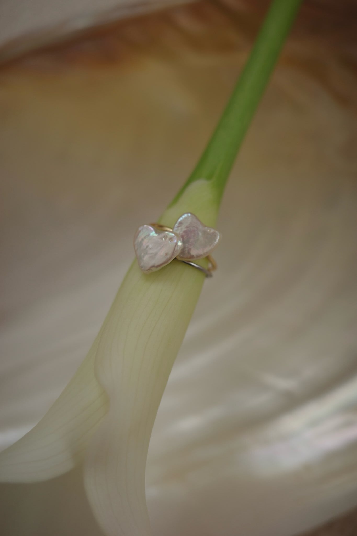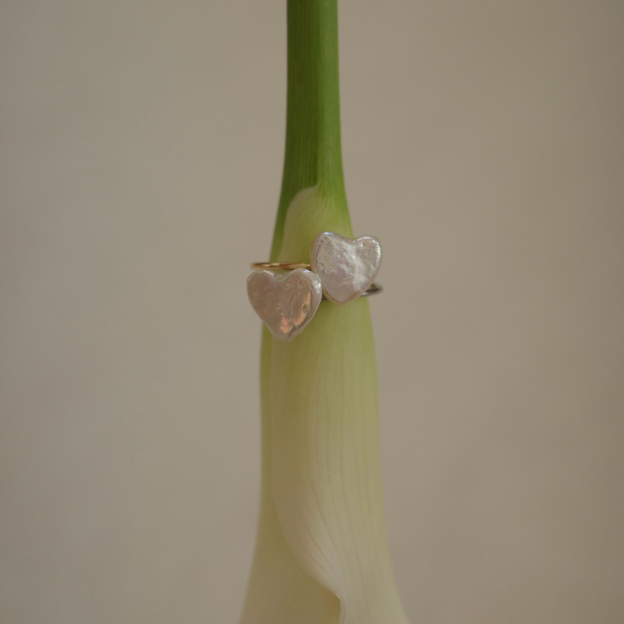 アンニュイな雰囲気がある柔らかいパールに、リング部分は華奢見えする細めのものを採用いたしました。