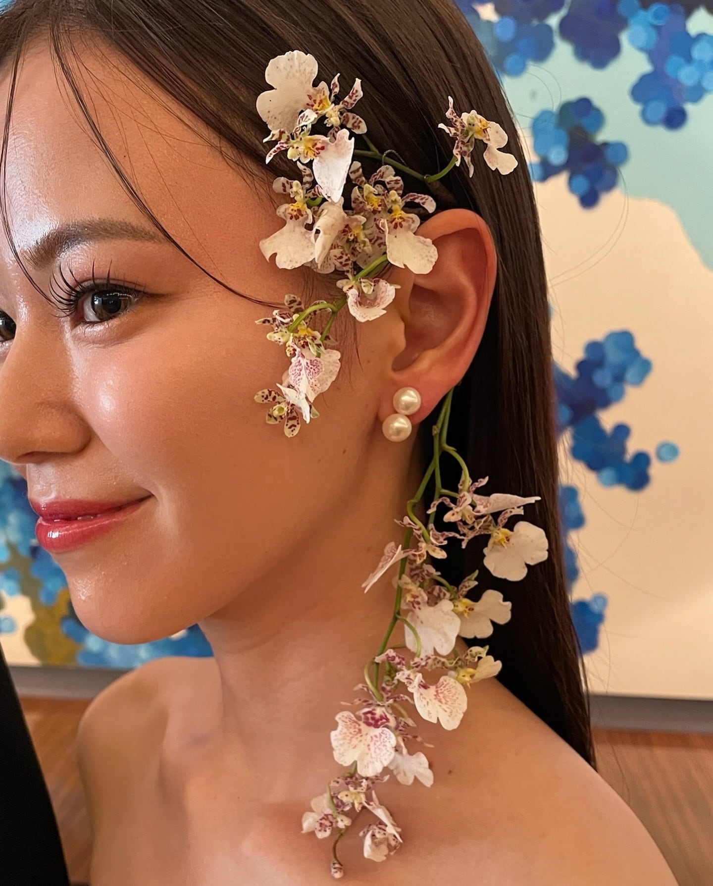 また、どんなドレスとも合わせやすく、アップスタイルからダウンスタイル、個性的なスタイルまで様々なヘアスタイルに馴染んでくれ、輝き、存在感を放ってくれます。